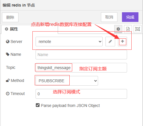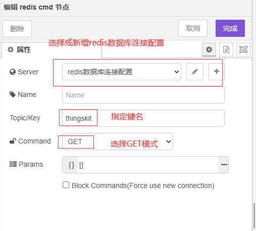 PS:在配置redis相关节点的时候千万要匹配操作内容与命令,若是随便配置一通,可能导致node-red崩溃。