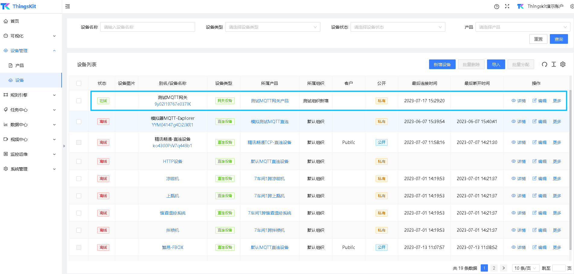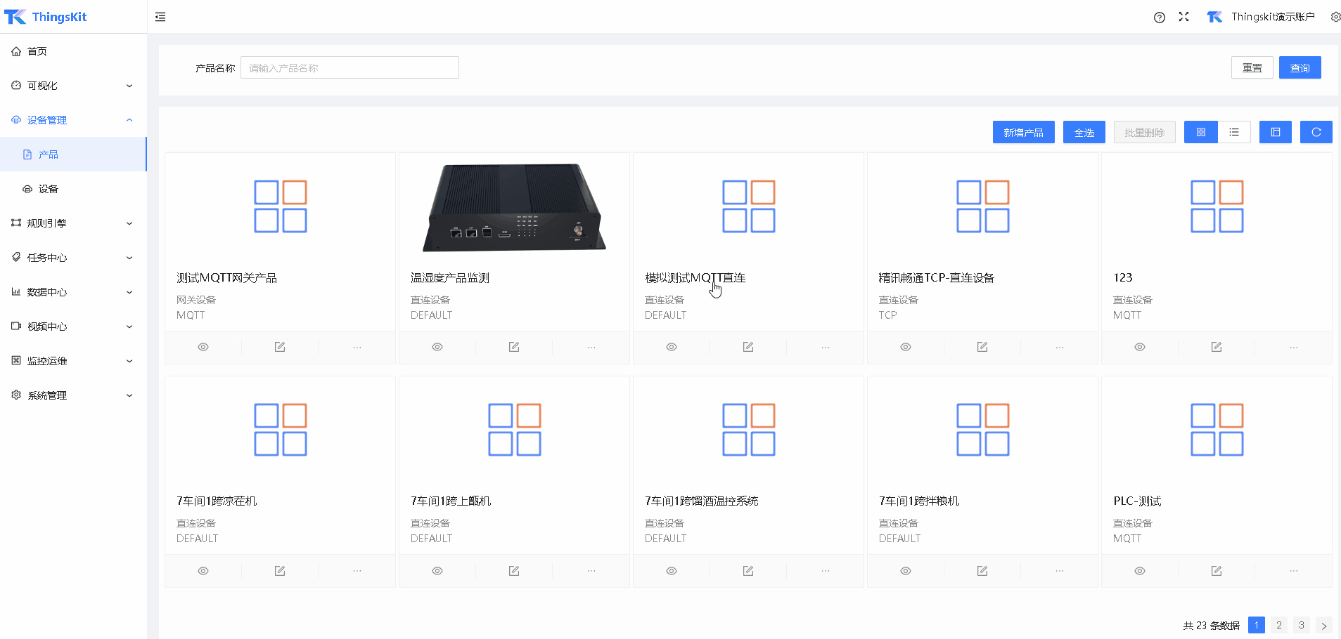 产品是指一类设备的抽象概念,比如温湿度传感器产品、智能电表产品、智能环控设备、某品牌水肥一体机产品、某品牌网关产品等等,他们具备相同的属性、服务等。