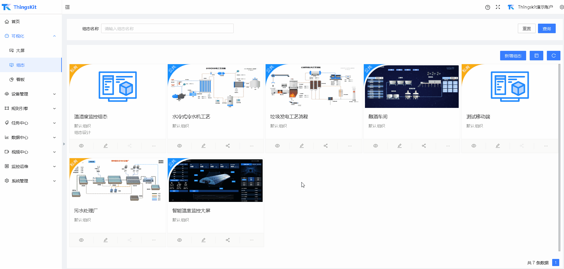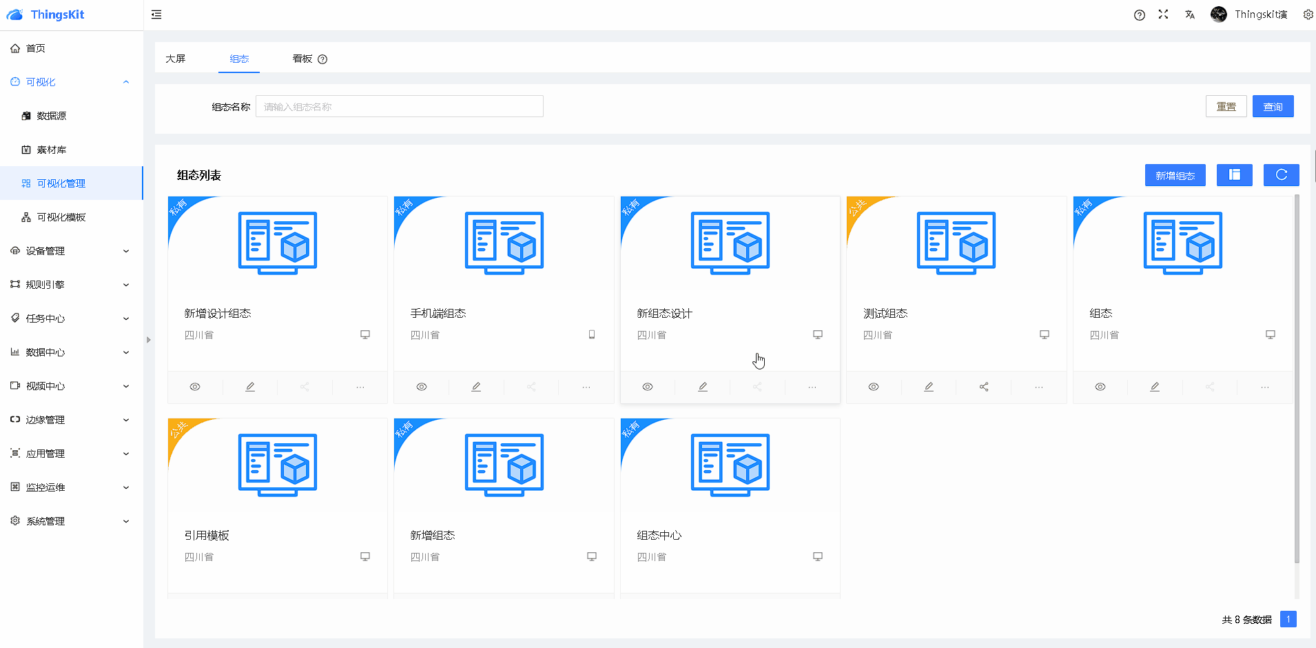 进入可视化管理界面,选择组态界面,单击“新增组态”,在弹出的新增组态框中,填写组态名称和选择所属组织及产品 ;最后单击 “确认”按钮。