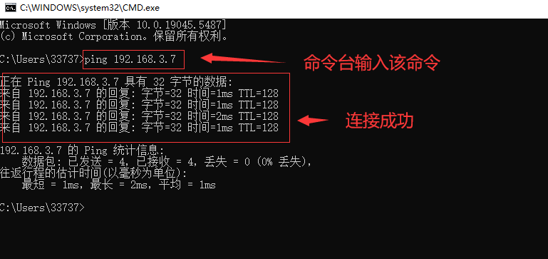 在“运行”窗口输入CMD命令打开命令台,再通过"ping"命令访问设备默认IP“192.168.3.7”查看设备是否连接成功。