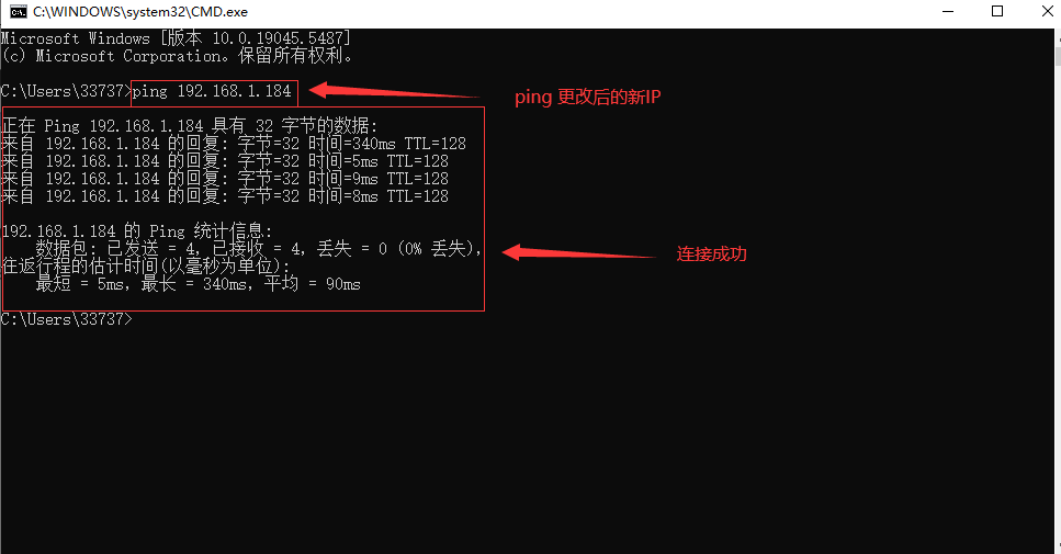 再次进行网络验证:设备重启后、将设备接入当前网络交换机,然后用ping命令访问