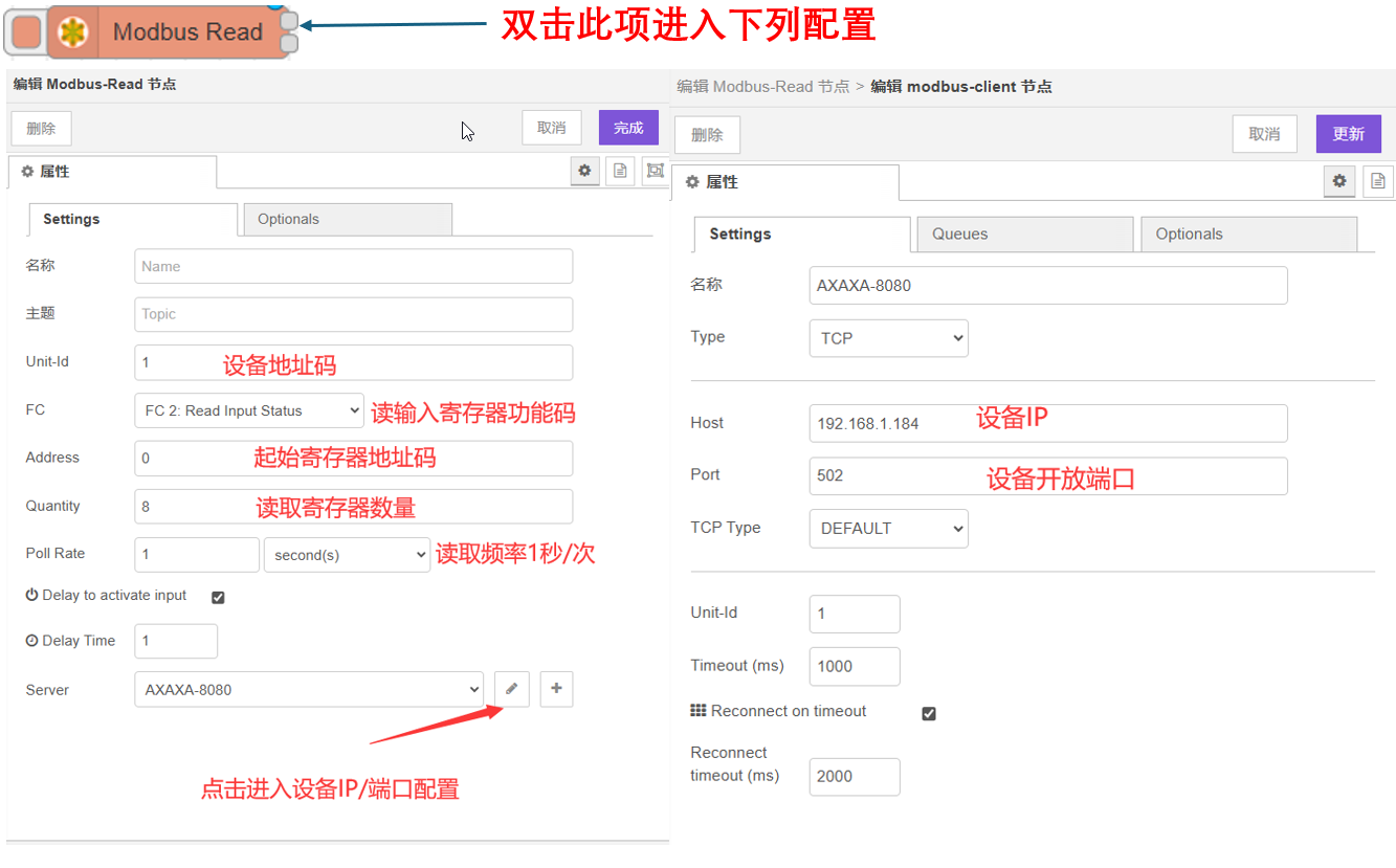 因配置时的场景不同,导入配置中的传感器设备地址码或EBYTE设备的IP及其端口有所差异,可作如下更改: