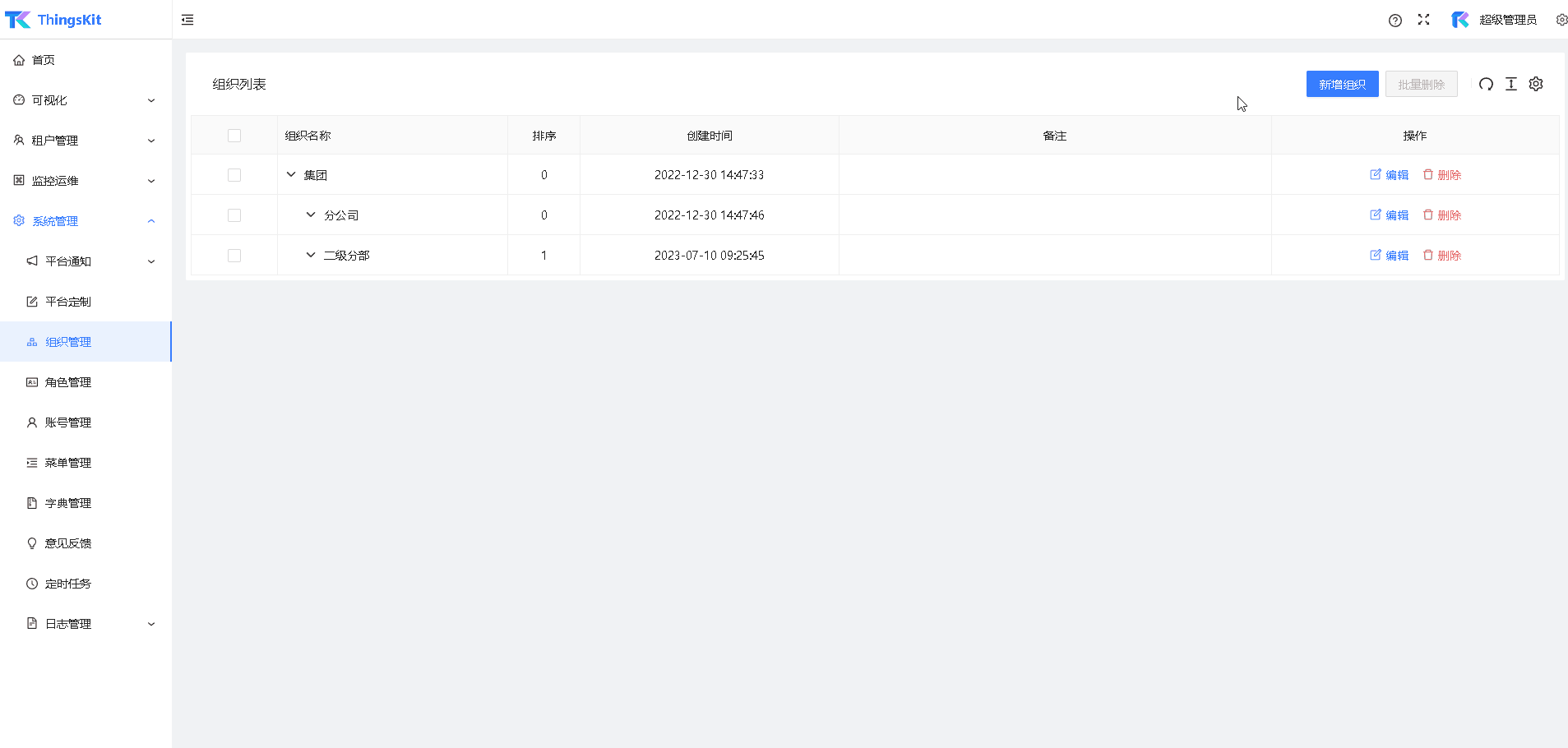 组织作为资源的容器,用于承载资源与划分资源的所属关系。每个设备、产品、可视化、任务等等,都需要选择所属组织,便于资源划分。
