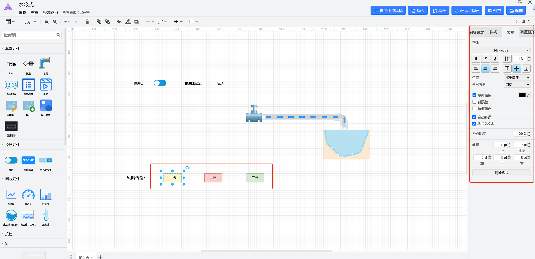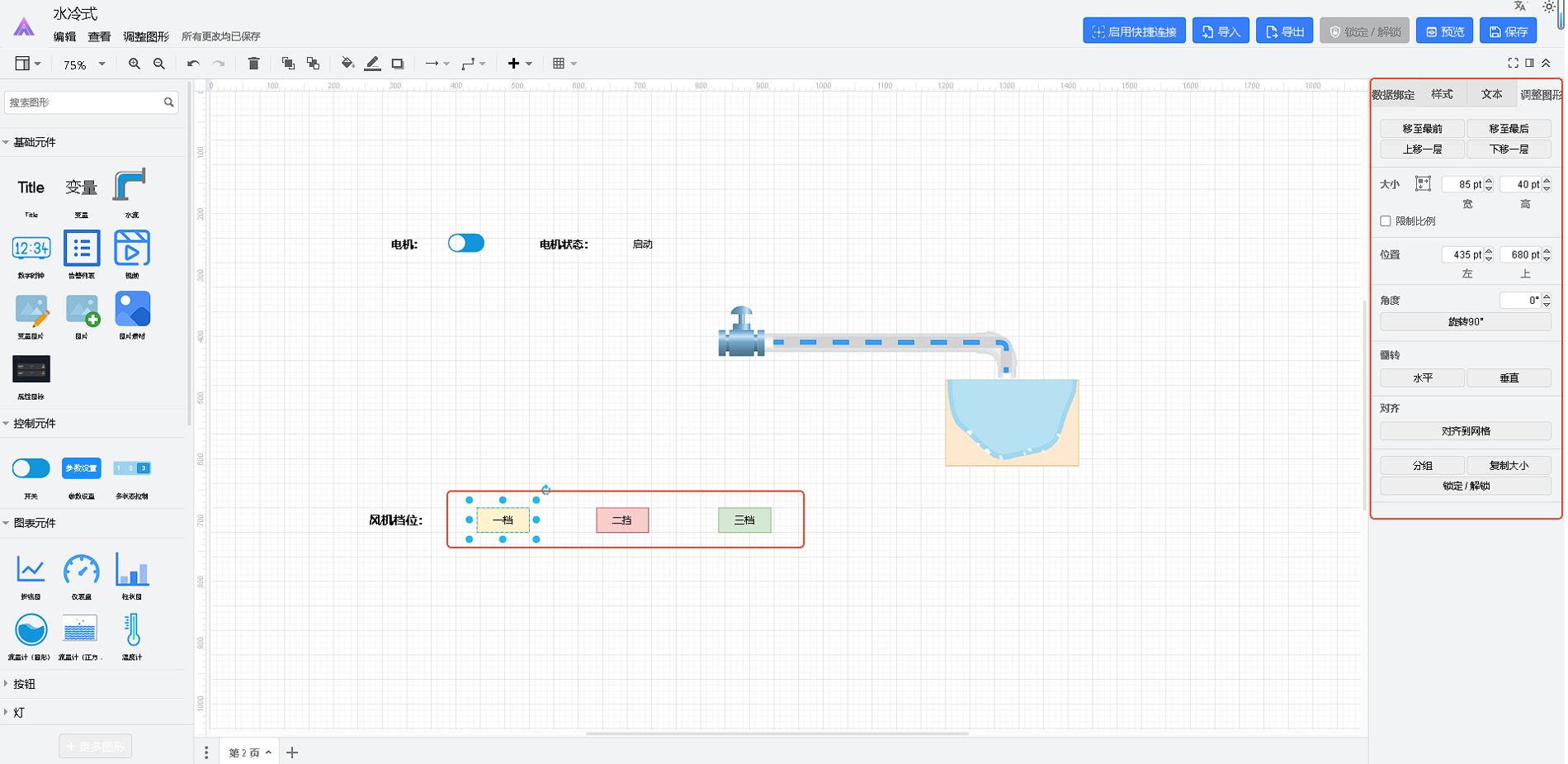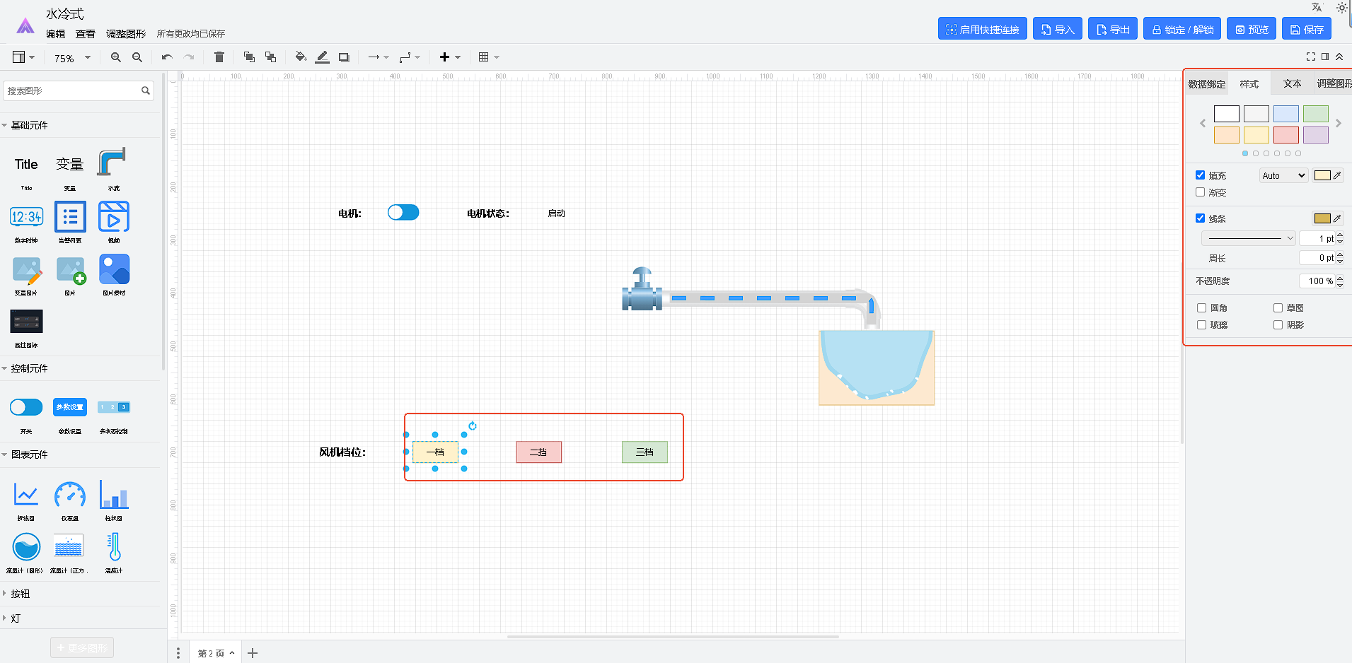 组态样式配置是指通过设置设计器中各个组件的样式属性,来改变它们的表现形式和外观。每个组件都有一些样式属性,如颜色、大小、字体、背景、边框等。通过改变这些属性,可以改变组件的外观和行为。