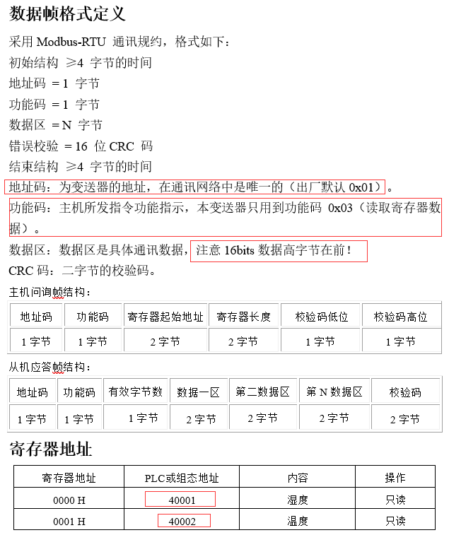 上图是设备厂家提供的RS485温湿度传感器说明书部分内容。