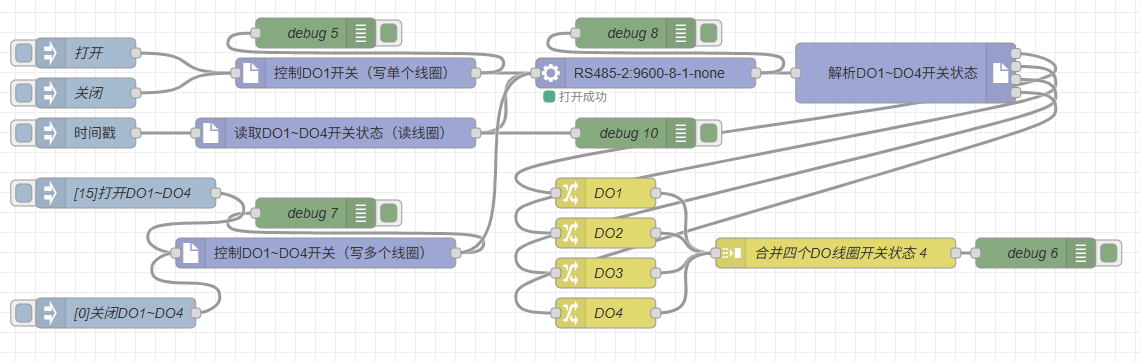 2、接入一个RS485的IO扩展器并用【串口】节点采集数据(线圈读写)