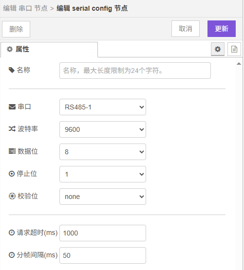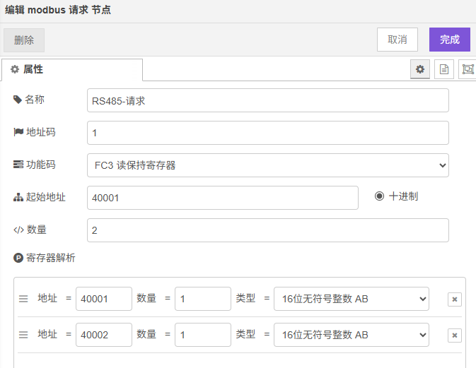 注:Modbus解析节点无需设置,其功能完全依赖于匹配的请求节点配置。