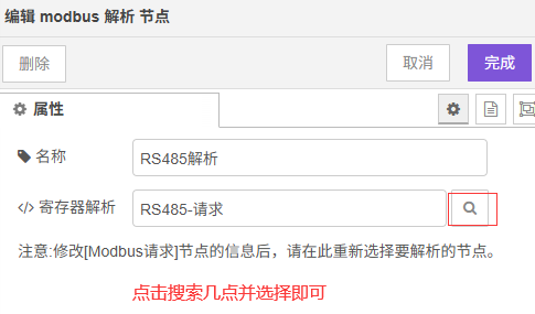 【Modbus解析节点】则需指定对应的请求节点,并按其配置解析响应数据。