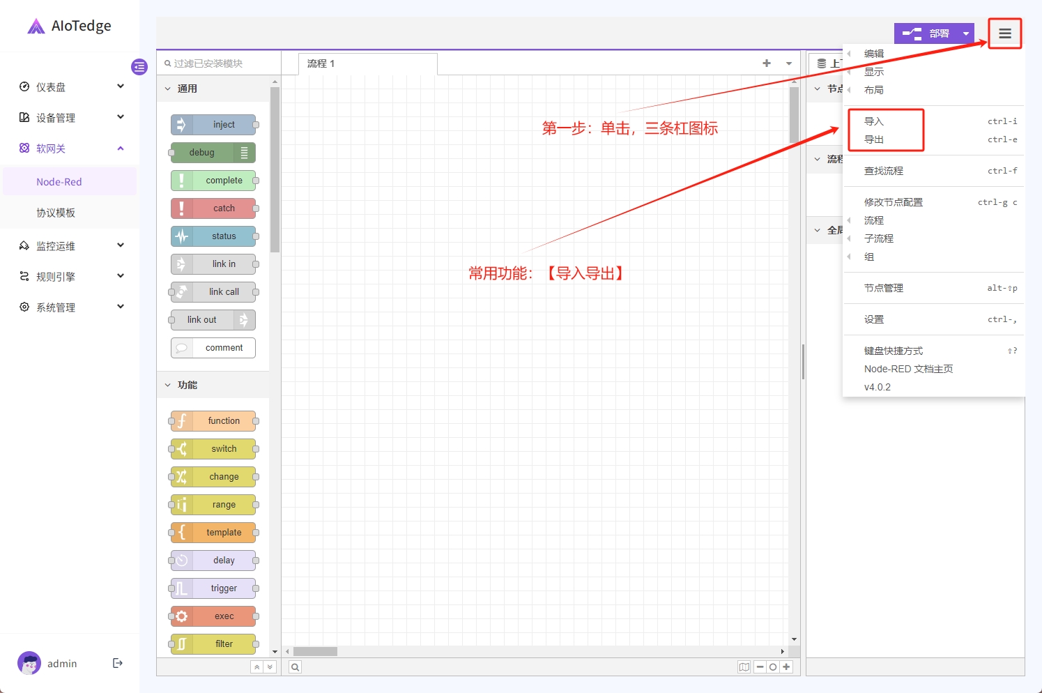 - 菜单栏:顶部菜单栏集成了部署按钮和主菜单项,其中流程的导入与导出功能也位于此菜单栏中。