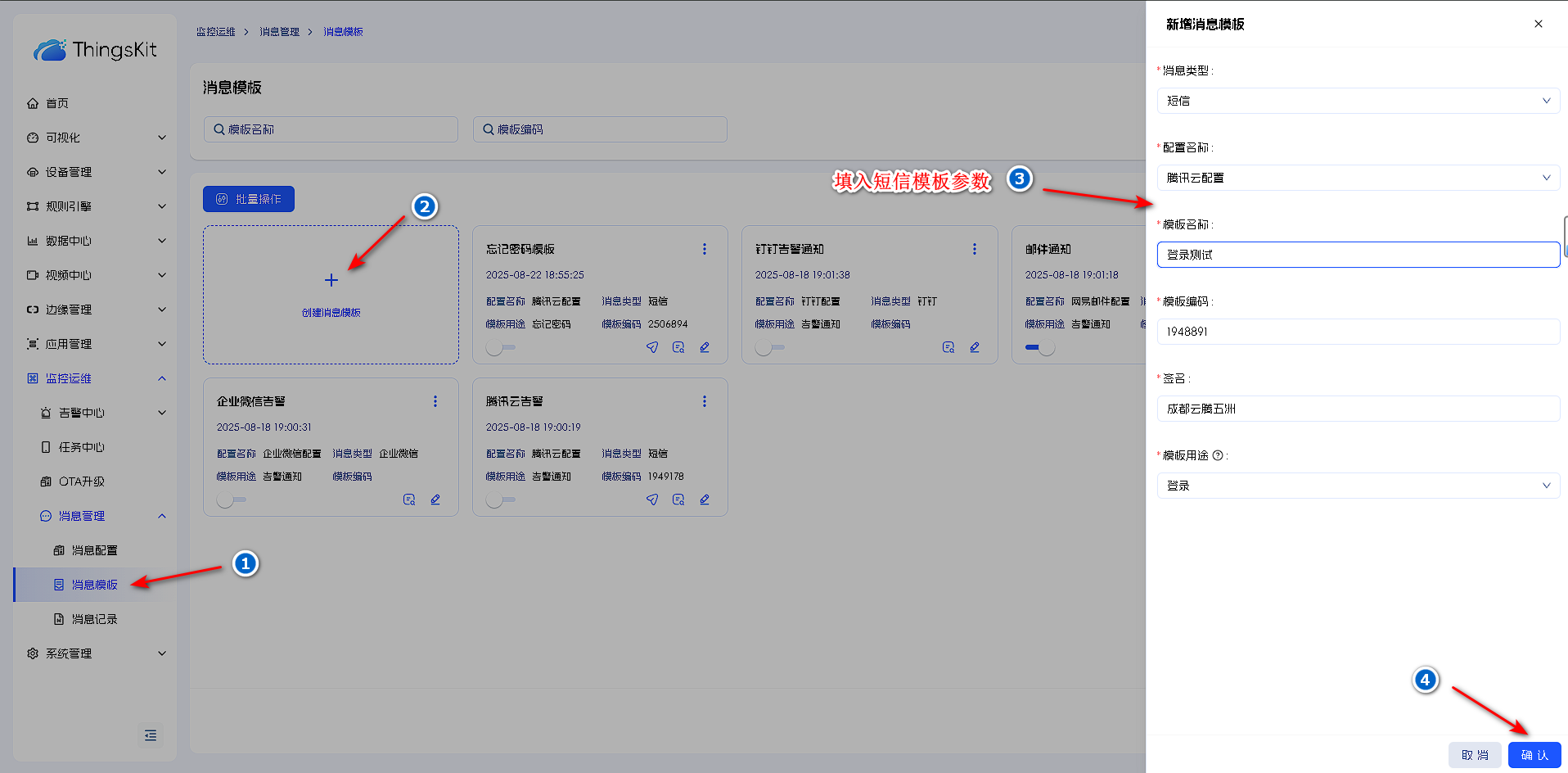 点击新增消息模板按钮,选择短信或邮件并填入相关参数,确认新增。