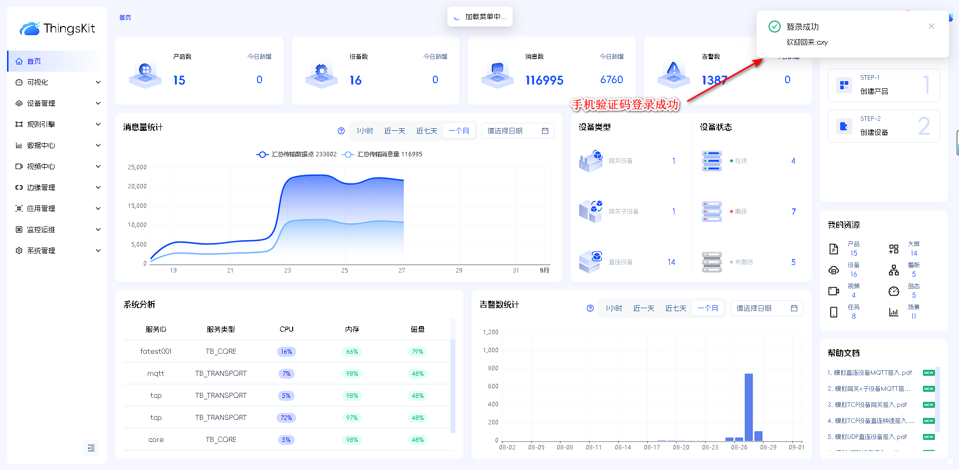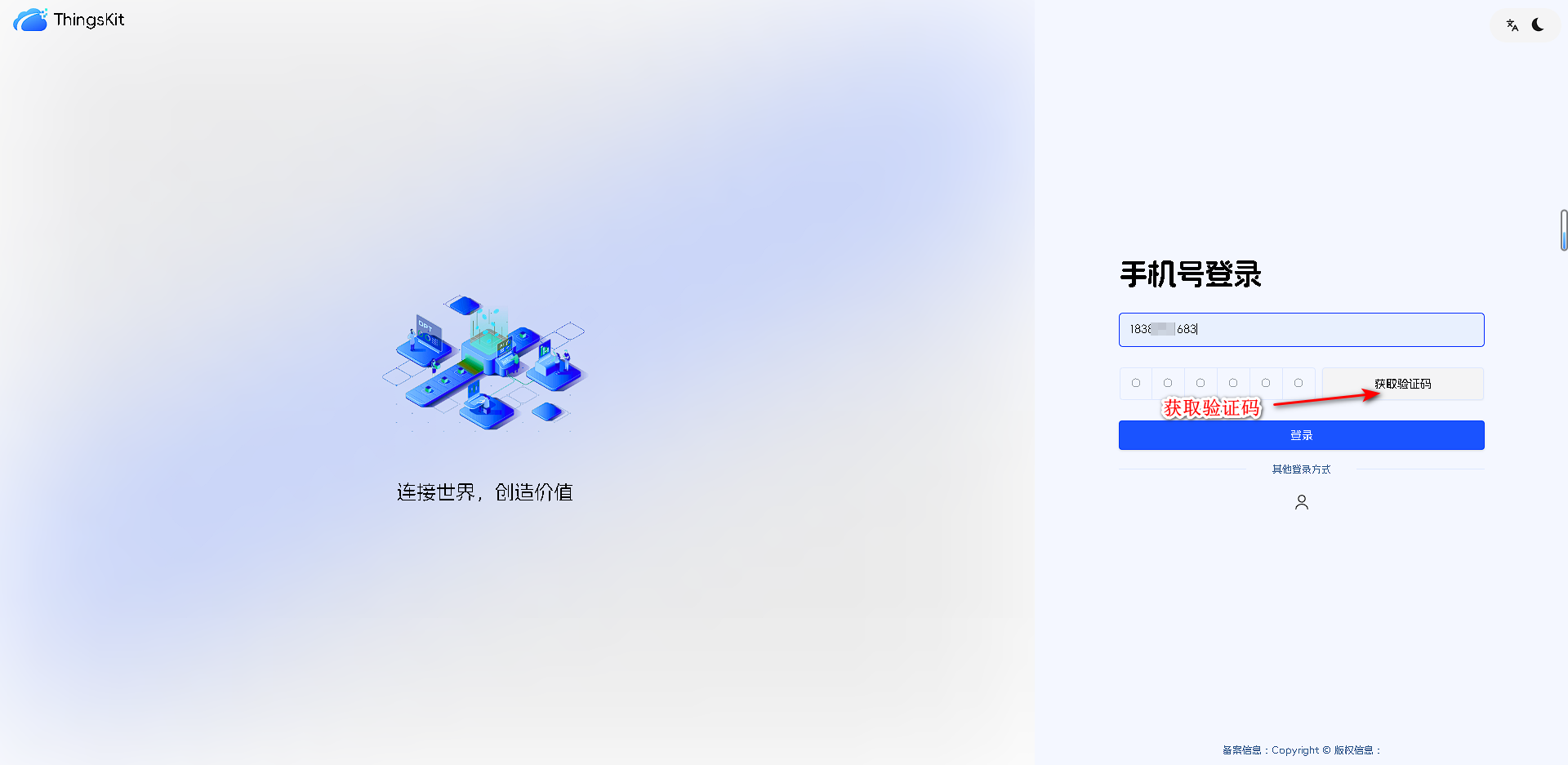 填入租户管理员手机号后点击获取验证码,将收到验证码填入,点击登录按钮,此时成功登录租户管理员账号。