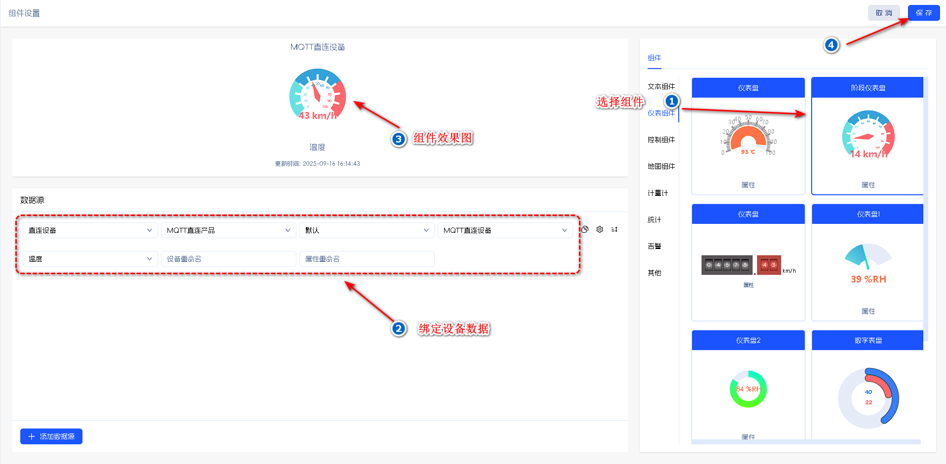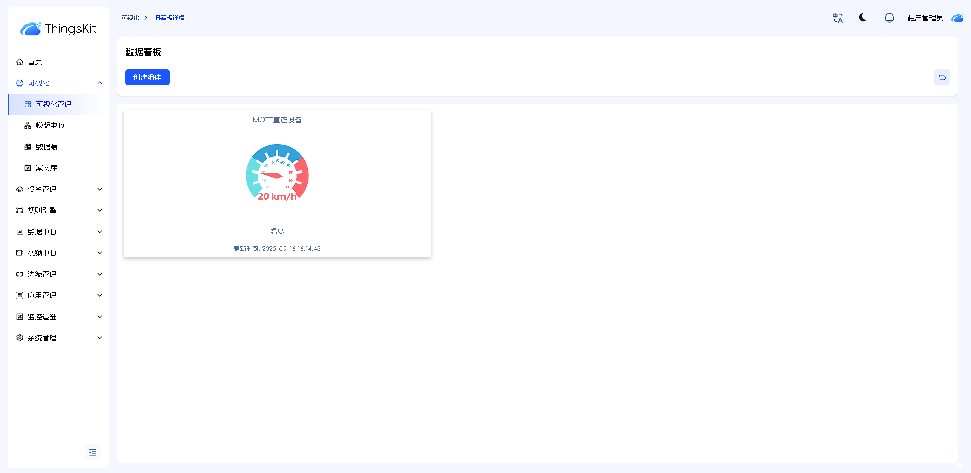 一个数据看板中,可以添加多个不同的组件样式;一个组件中可以绑定多个不同设备数据源。