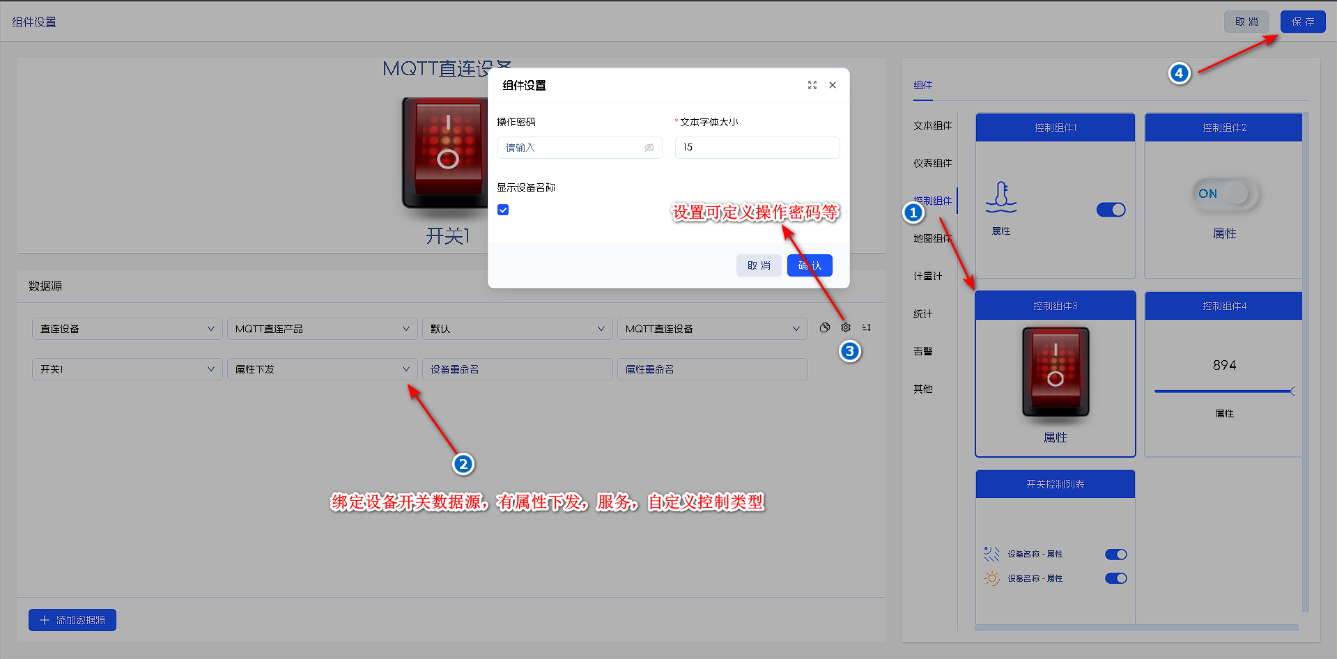 控制组件数据源为非TCP产品,则其控制命令下发为产品物模型=>属性,且具备状态显示功能。