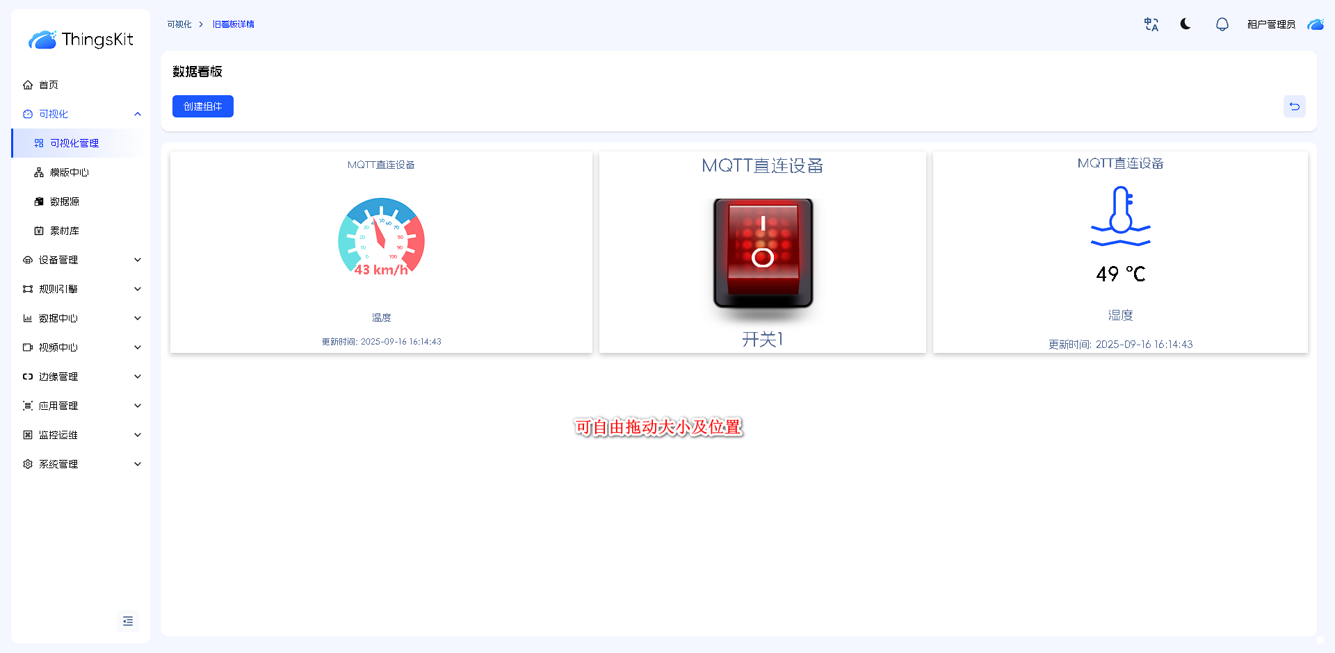 数据看板的作用:让你可以快速搭建已接入设备进行数据可视化展示,以及可交互的控制界面。简单拖拽,即可构建实用的数据看板。