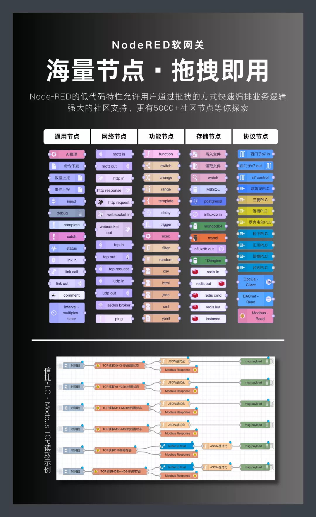 - 低代码开发:通过内置的Node-RED平台,用户可以通过拖拽式流编程快速编排业务流程,无需编写代码。