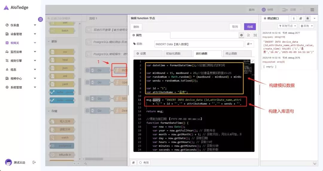 [{"id":"e1390262b64eaea2","type":"function","z":"cb5f1a5e643cfd9e","name":"INSERT Data【插入数据】","func":"nvar datetime = formatDateTime();//创建日期格式的时间nnvar minBound = 15, maxBound = 25;//创建温度模拟数据15~25nvar randomNum = Math.random() * (maxBound - minBound) + minBound;nvar wendu = randomNum.toFixed(2);nnvar id = "1";nvar attributeName = "温度";nnmsg.query = "INSERT INTO device_data (id,attribute_name,attribute_value,create_time) VALUES "n + "('" + id + "','" + attributeName + "','" + wendu + "','" + datetime +"')";nnreturn msg;nn//得到当前日期 【YYYY-MM-DD HH:mm:ss】nfunction formatDateTime() {n var now = new Date();n var year = now.getFullYear(); // 获取年份n var month = now.getMonth() + 1; // 获取月份,月份从0开始,所以需要+1n var day = now.getDate(); // 获取日期n var hours = now.getHours(); // 获取小时n var minutes = now.getMinutes(); // 获取分钟n var seconds = now.getSeconds(); // 获取秒数nn // 将单个数字格式化为两位数(例如,1变为01)n month = month ,"outputs":1,"timeout":"","noerr":0,"initialize":"","finalize":"","libs":[],"x":280,"y":400,"wires":[["c5f0738fc74b375b","bbec5b56a85c8470"]]},{"id":"d45a48775b35da17","type":"inject","z":"cb5f1a5e643cfd9e","name":"Go","props":[{"p":"payload"},{"p":"topic","vt":"str"}],"repeat":"","crontab":"","once":false,"onceDelay":"","topic":"","payloadType":"date","x":90,"y":400,"wires":[["e1390262b64eaea2"]]},{"id":"861bc8f9d83a66d0","type":"inject","z":"cb5f1a5e643cfd9e","name":"Go","props":[{"p":"payload"},{"p":"topic","vt":"str"}],"repeat":"","crontab":"","once":false,"onceDelay":"","topic":"","payloadType":"date","x":90,"y":460,"wires":[["b4fcb51aa1b56f1d"]]},{"id":"b4fcb51aa1b56f1d","type":"function","z":"cb5f1a5e643cfd9e","name":"Update Data【更新数据】","func":"var value = "22.55";nvar id = "1";nnmsg.query = "UPDATE device_data SET attribute_value = '" + value + "' WHERE id='" + id +"'";nnreturn msg;","outputs":1,"timeout":"","noerr":0,"initialize":"","finalize":"","libs":[],"x":270,"y":460,"wires":[["c5f0738fc74b375b","bbec5b56a85c8470"]]},{"id":"266377c8083bdcc4","type":"function","z":"cb5f1a5e643cfd9e","name":"Delete Data【删除数据】","func":"var id = "1";nmsg.query = "DELETE FROM device_data where id = '" + id +"'";nnreturn msg;","outputs":1,"timeout":"","noerr":0,"initialize":"","finalize":"","libs":[],"x":270,"y":600,"wires":[["c5f0738fc74b375b","bbec5b56a85c8470"]]},{"id":"15d8f7e707d57fe7","type":"inject","z":"cb5f1a5e643cfd9e","name":"Go","props":[{"p":"payload"},{"p":"topic","vt":"str"}],"repeat":"","crontab":"","once":false,"onceDelay":"","topic":"","payloadType":"date","x":90,"y":600,"wires":[["266377c8083bdcc4"]]},{"id":"f4e615c2ddbfce34","type":"inject","z":"cb5f1a5e643cfd9e","name":"Go","props":[{"p":"payload"},{"p":"topic","vt":"str"}],"repeat":"","crontab":"","once":false,"onceDelay":"","topic":"","payload":"warehouse","payloadType":"str","x":90,"y":540,"wires":[["6b77fc8e967cc078"]]},{"id":"6b77fc8e967cc078","type":"function","z":"cb5f1a5e643cfd9e","name":"SELECT Data【查询数据】","func":"msg.query = "SELECT * FROM device_data LIMIT 20";nnreturn msg;","outputs":1,"timeout":"","noerr":0,"initialize":"","finalize":"","libs":[],"x":280,"y":540,"wires":[["c5f0738fc74b375b","bbec5b56a85c8470"]]},{"id":"fe34c177e7e53e67","type":"comment","z":"cb5f1a5e643cfd9e","name":"PostgreSQL常规操作:使用时,注意配置好的数据库地址\用户名\密码","info":"","x":270,"y":320,"wires":[]},{"id":"c269a50715b179cf","type":"comment","z":"cb5f1a5e643cfd9e","name":"PostgreSQL模拟测试-双击打开查看【操作表的结构】","info":"-- ----------------------------n-- Table structure for device_datan-- ----------------------------nDROP TABLE IF EXISTS "public"."device_data";nCREATE TABLE "public"."device_data" (n "id" int4 NOT NULL,n "attribute_name" varchar(50) COLLATE "pg_catalog"."default",n "attribute_value" float8,n "create_time" timestamp(0)n)n;nCOMMENT ON COLUMN "public"."device_data"."id" IS 'ID';nCOMMENT ON COLUMN "public"."device_data"."attribute_name" IS '属性名称';nCOMMENT ON COLUMN "public"."device_data"."attribute_value" IS '属性值';nn-- ----------------------------n-- Primary Key structure for table device_datan-- ----------------------------nALTER TABLE "public"."device_data" ADD CONSTRAINT "deviceData_pkey" PRIMARY KEY ("id");","x":220,"y":260,"wires":[]},{"id":"b66c05171155f738","type":"comment","z":"cb5f1a5e643cfd9e","name":"双击打开查看【官方使用文档】","info":"官方使用文档:nhttps://yunteng.yuque.com/to2an3/rrd8yw/oaas8gg93cg4b94q","x":150,"y":200,"wires":[]},{"id":"c5f0738fc74b375b","type":"postgresql","z":"cb5f1a5e643cfd9e","name":"PostgreSQL数据库操作","query":"","postgreSQLConfig":"066ab6a845d1e5d4","split":false,"rowsPerMsg":1,"outputs":1,"x":530,"y":500,"wires":[["b83ef5644643c814"]]},{"id":"b83ef5644643c814","type":"debug","z":"cb5f1a5e643cfd9e","name":"debug 2576","active":true,"tosidebar":true,"console":false,"tostatus":false,"complete":"false","statusVal":"","statusType":"auto","x":730,"y":500,"wires":[]},{"id":"bbec5b56a85c8470","type":"debug","z":"cb5f1a5e643cfd9e","name":"debug 2577","active":true,"tosidebar":true,"console":false,"tostatus":false,"complete":"query","targetType":"msg","statusVal":"","statusType":"auto","x":510,"y":580,"wires":[]},{"id":"066ab6a845d1e5d4","type":"postgreSQLConfig","name":"DBConnection-local","host":"192.168.1.31","hostFieldType":"str","port":"5432","portFieldType":"num","database":"aiotedge","databaseFieldType":"str","ssl":"false","sslFieldType":"bool","applicationName":"","applicationNameType":"str","max":"10","maxFieldType":"num","idle":"1000","idleFieldType":"num","connectionTimeout":"10000","connectionTimeoutFieldType":"num","user":"postgres","userFieldType":"str","password":"postgres","passwordFieldType":"str"}]