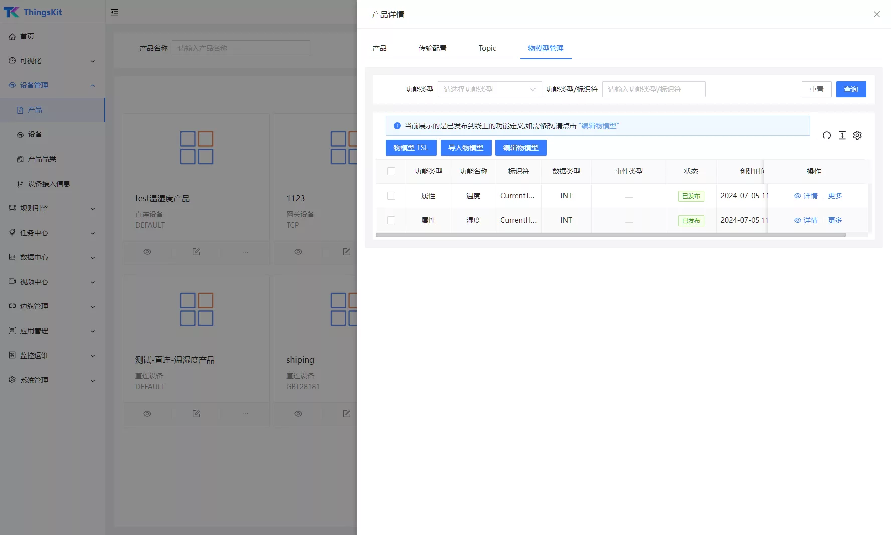 物模型是物联网平台中用于描述产品功能的数据模型。在ThingsKit物联网平台中,物模型是物理空间中的实体(如传感器、车载装置、楼宇、工厂等)在云端的数字化表示,从属性、服务和事件三个维度,分别描述了该实体是什么、能做什么、可以对外提供哪些信息。