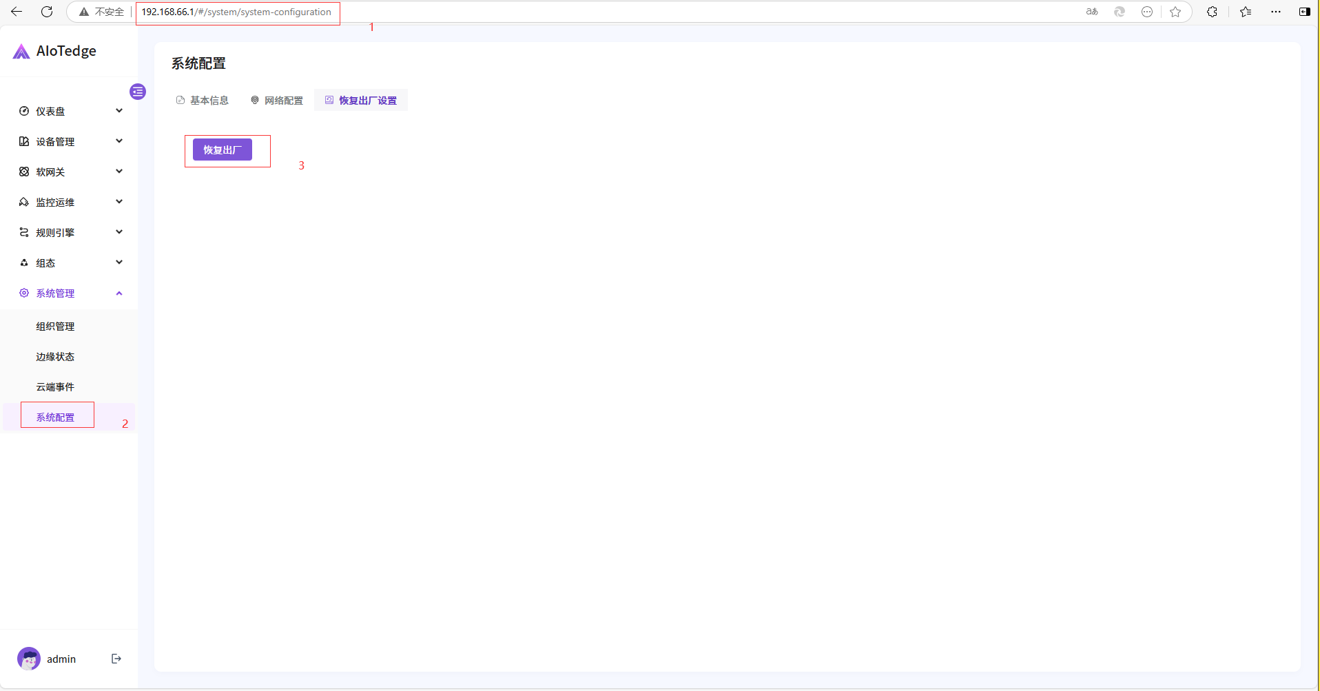 第二步:192.168.66.1登入一体机(出厂默认独立使用),点击恢复出厂设置,进入边缘实例配置界面