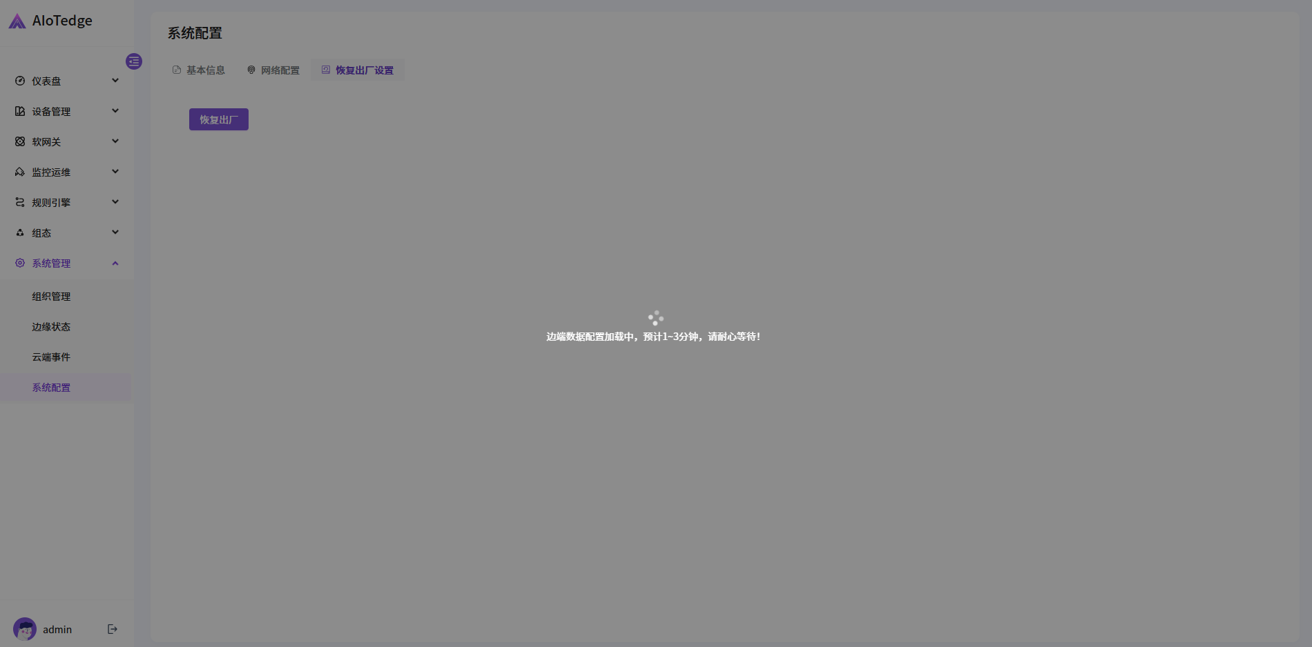 点击“恢复出厂”会清除一体机所有数据,等待一段时间后会进入云边协同配置界面