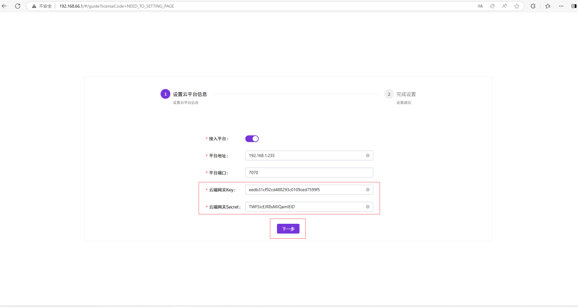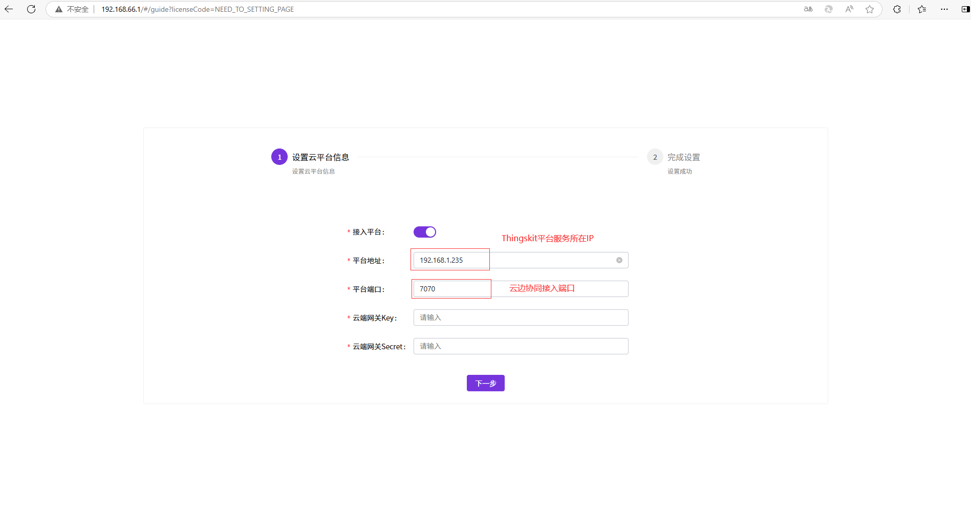 将信息填入“云边协同”配置界面后点击“下一步”进行协同配置: