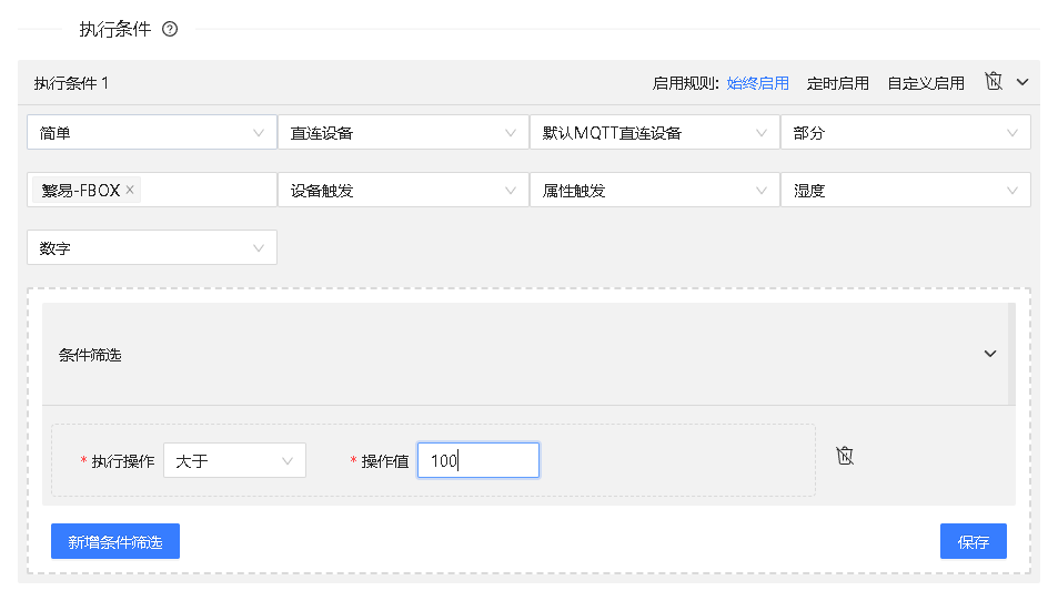 示例:繁易-FBOX设备湿度大于100触发该场景联动。
