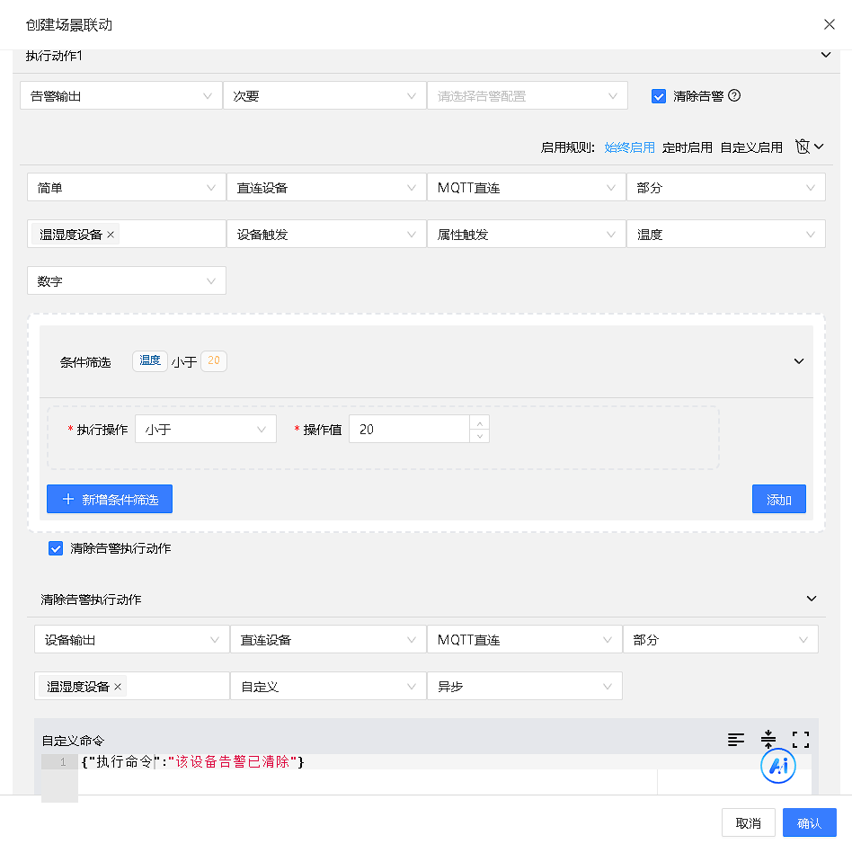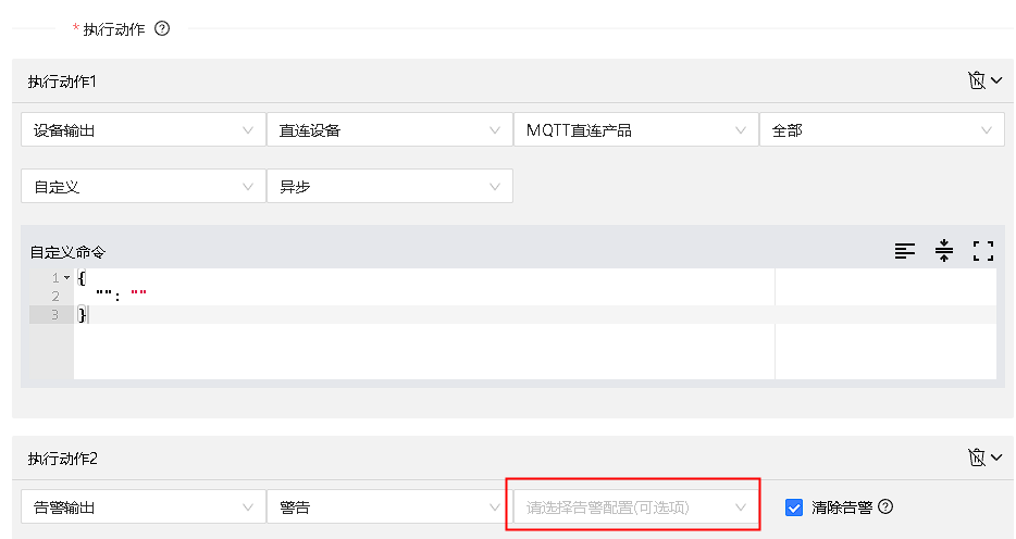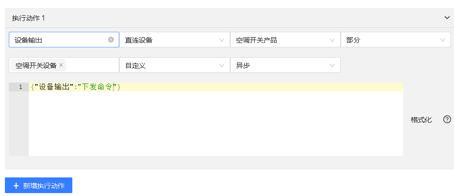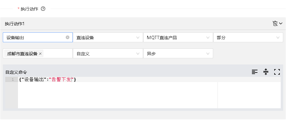 自定义执行动作,设备为MQTT设备下发为json数据格式,TCP设备下发为自定义命令。