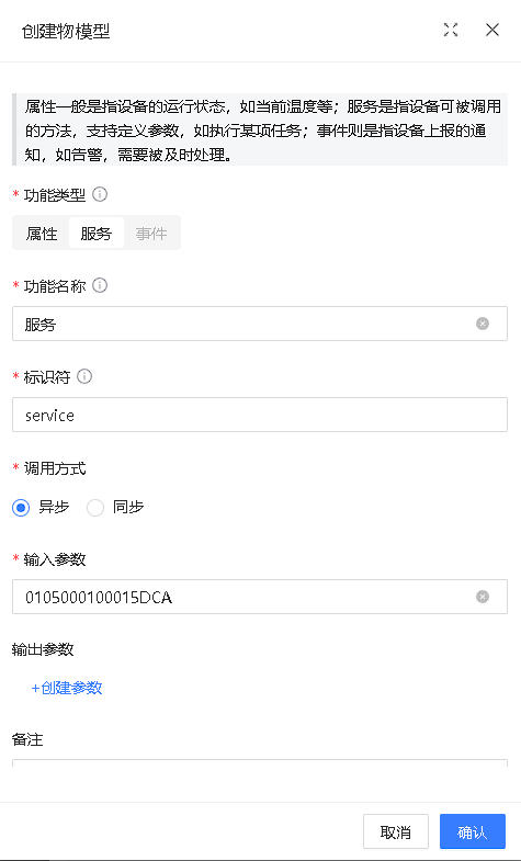 TCP自定义类型产品创建物模型为服务属性配置示例。