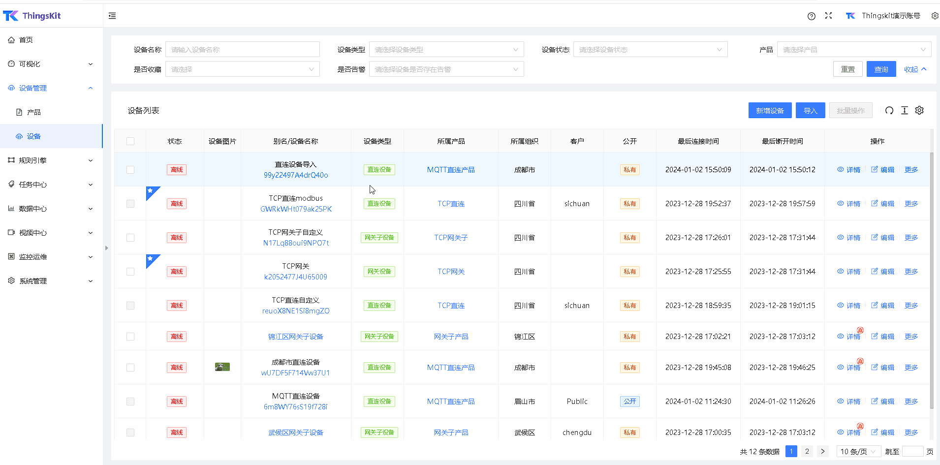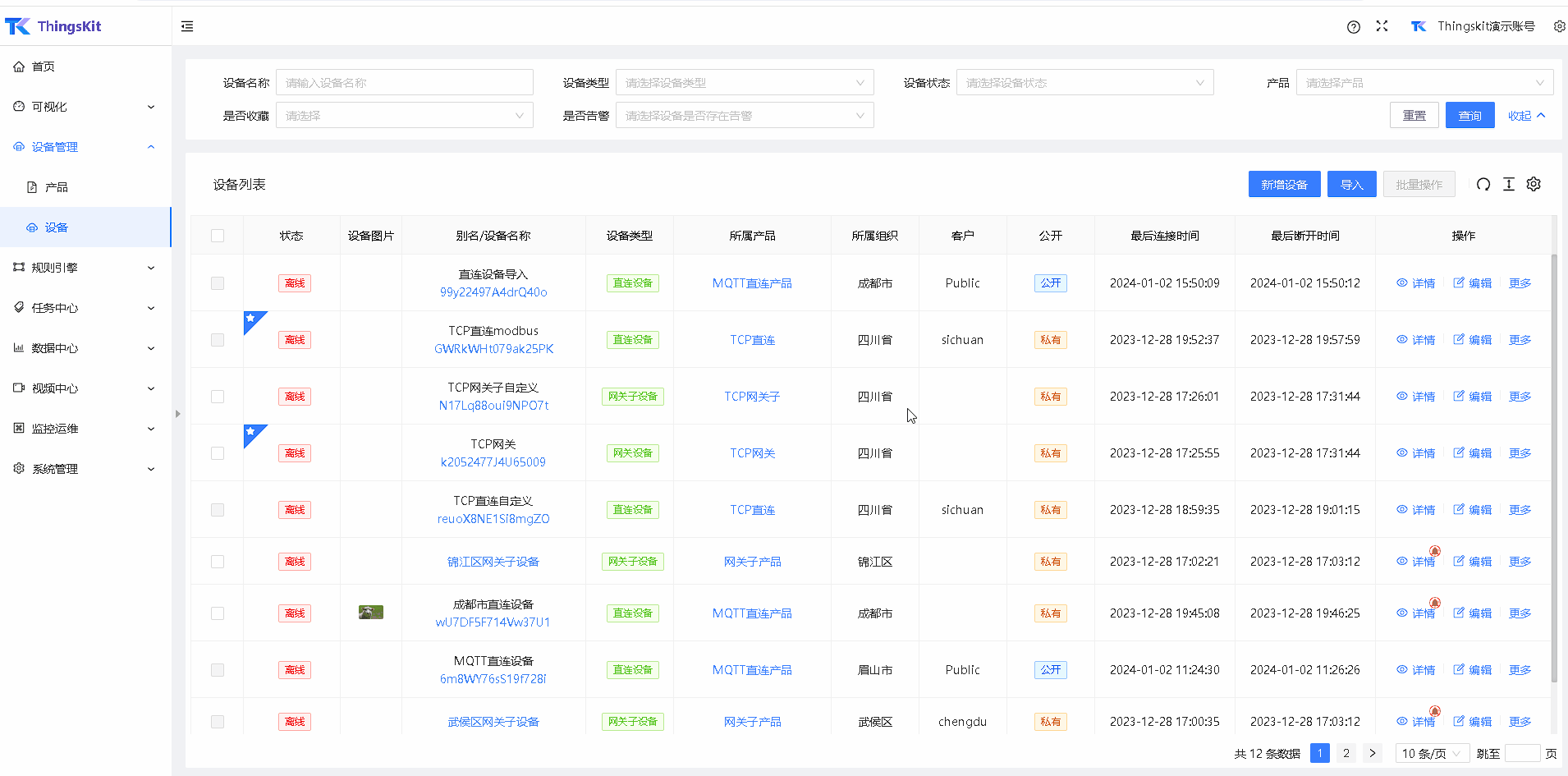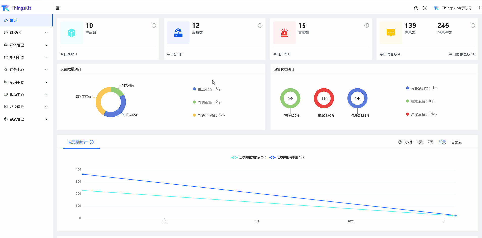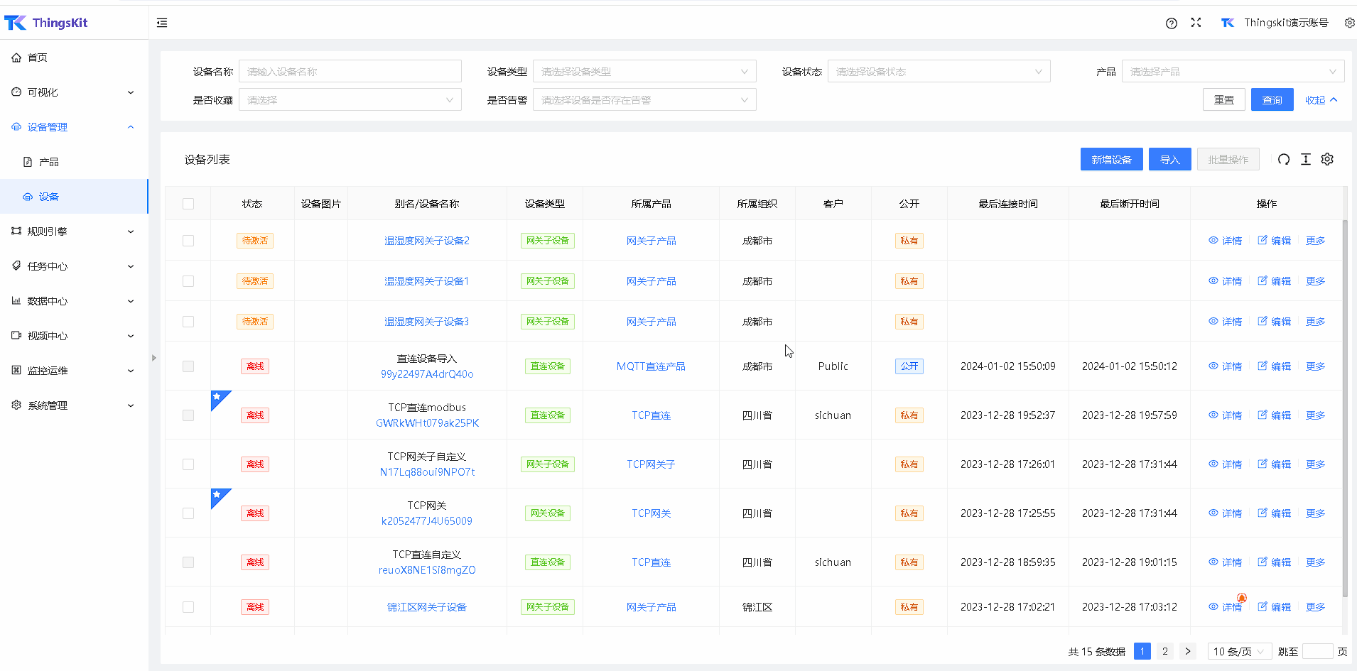 在ThingsKit物联网平台中,设备指的是连接到网络中的各种物理设备或传感器,这些设备可以收集和传输数据,并且可以通过网络进行远程访问和控制。物联网平台中的设备可以是各种类型的,例如智能家居设备、传感器、智能终端、摄像头等等,这些设备可以通过物联网平台进行管理和监控,实现数据的采集和传输,从而为各种应用提供支持。