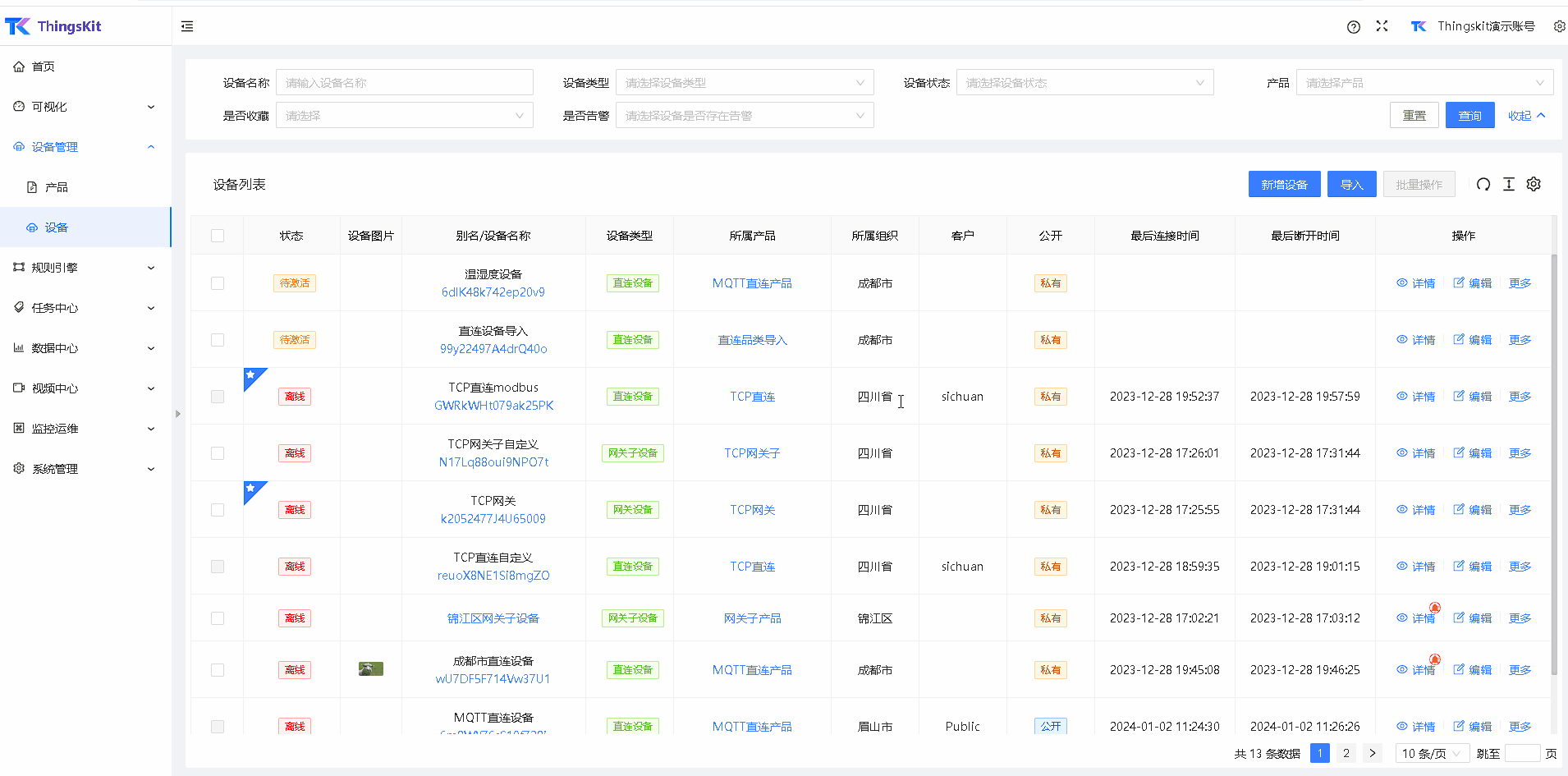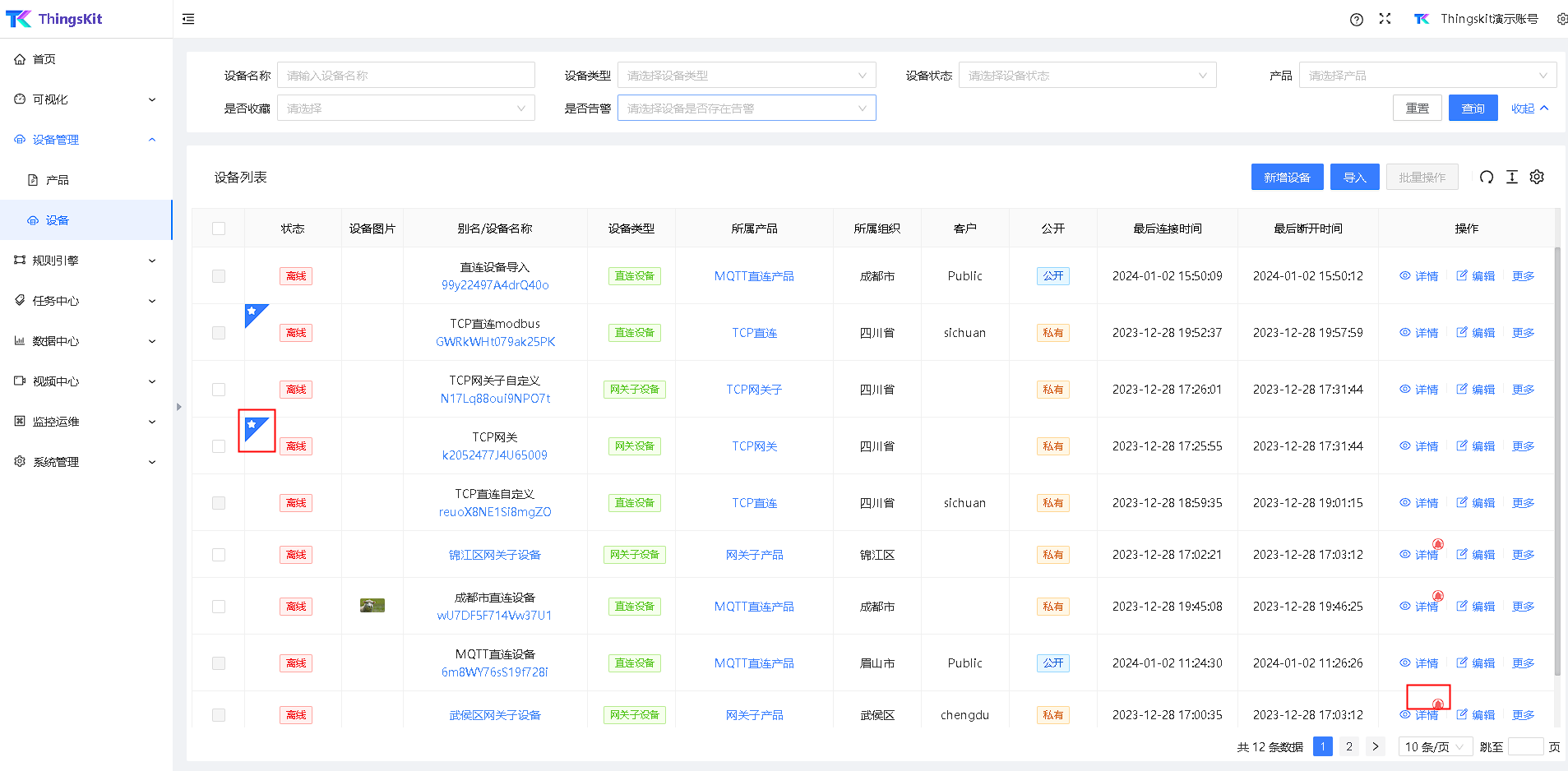 通过设备名称、设备类型、设备状态、产品、是否收藏、是否告警多个条件对设备数据进行查询。