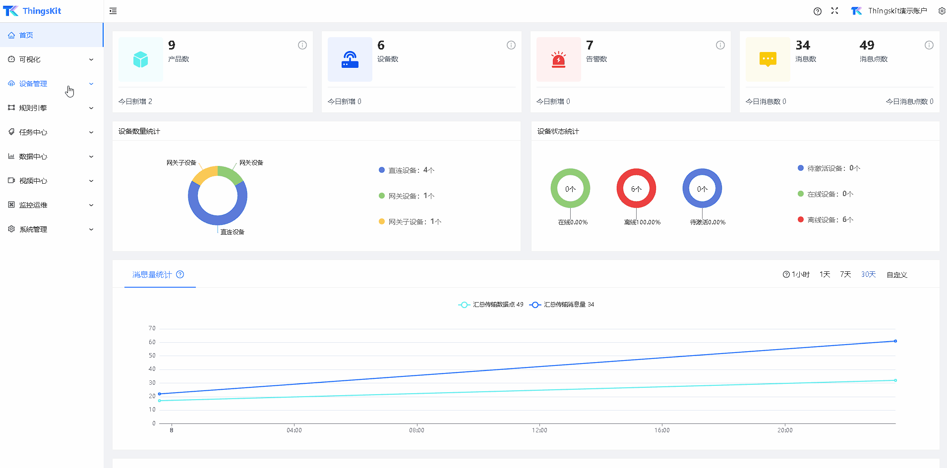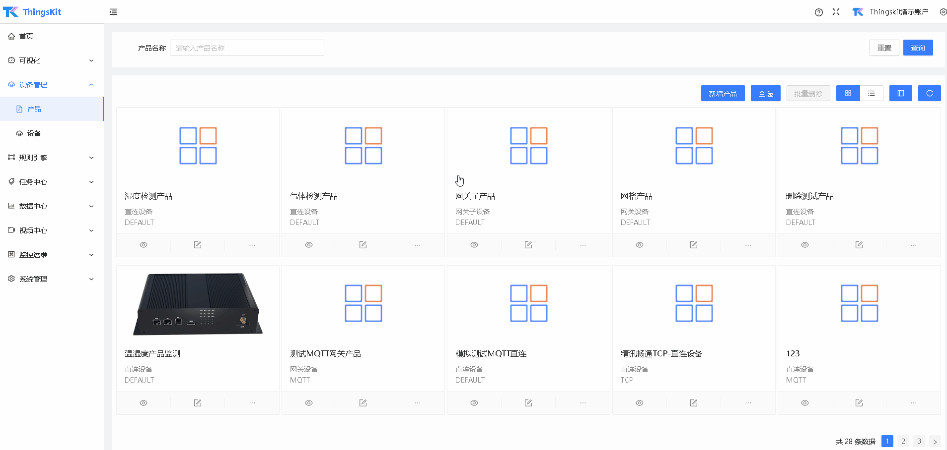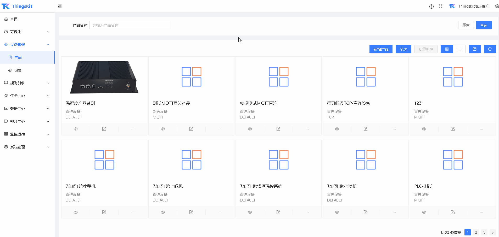 ThingsKit物联网平台中的产品是指一类设备的抽象概念,比如温湿度传感器产品、某某品牌网关产品等等,他们具备相同的属性、服务和事件等。