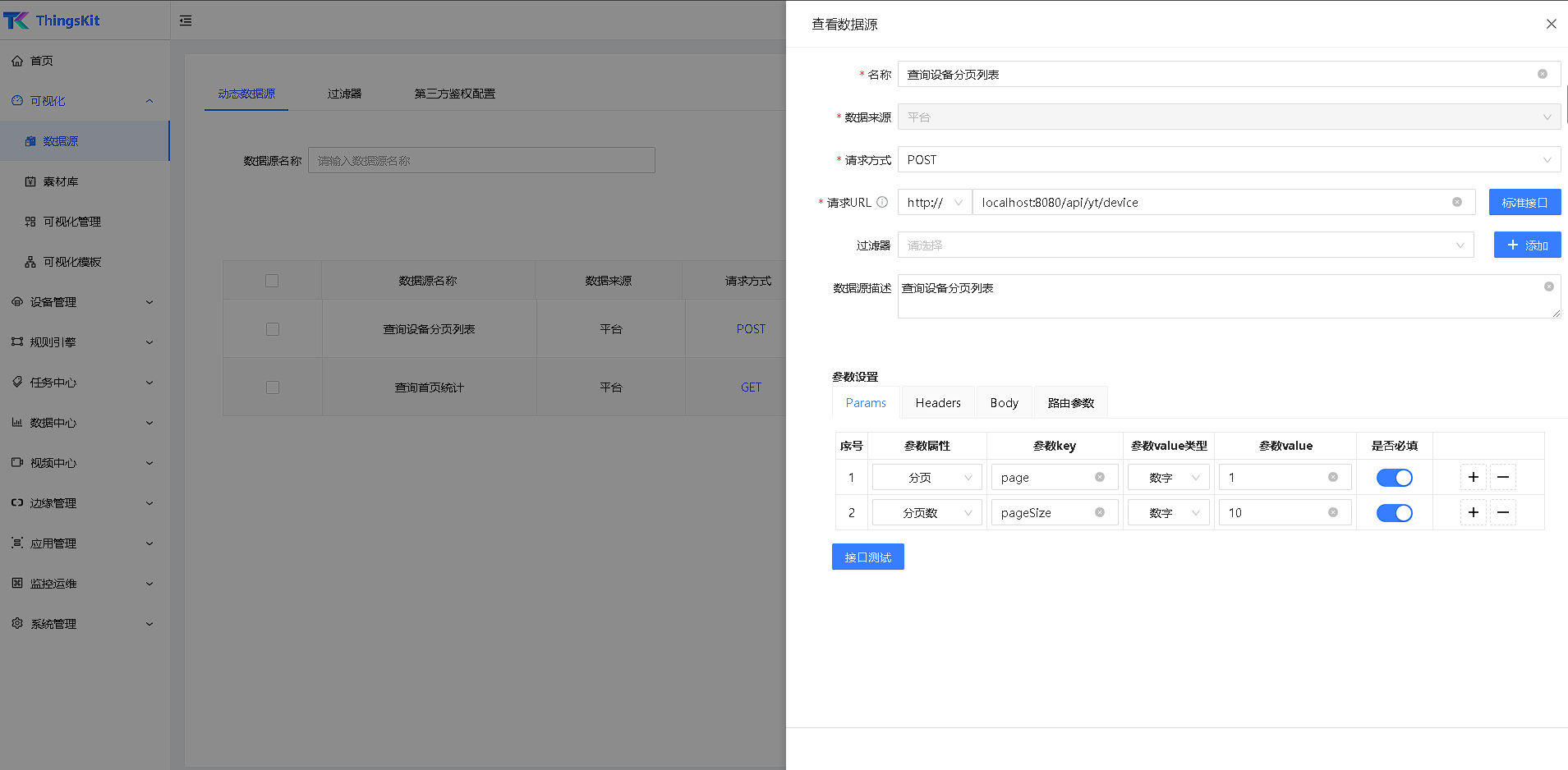 点击查看按钮,对动态数据源的参数信息进行查看和测试。