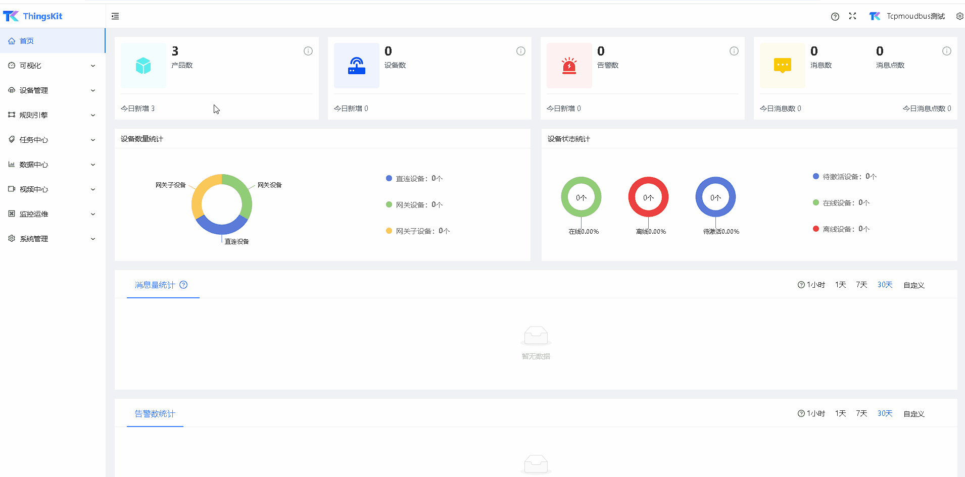 操作流程:添加TCP产品–>添加该产品设备–>通过NetAssist.exe网络调试助手连接设备–>先推送符合温湿度寄存器数的16进制数据–>再推送符合一氧化碳和二氧化碳寄存器数的16进制数据。