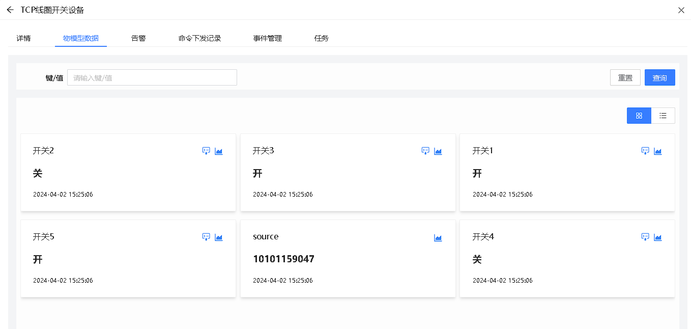 开关物模型json:开关从0位开始解析,线圈为读取01,写入05,测试开关为5个,寄存器地址0-4连续,示例开关16进制数据为:01 01 01 15 90 47,开关状态为0001 0101,从右往左进行控制则为开,关,开,关,开。