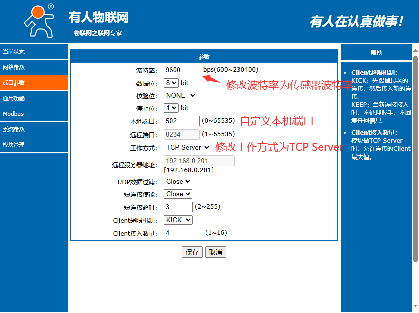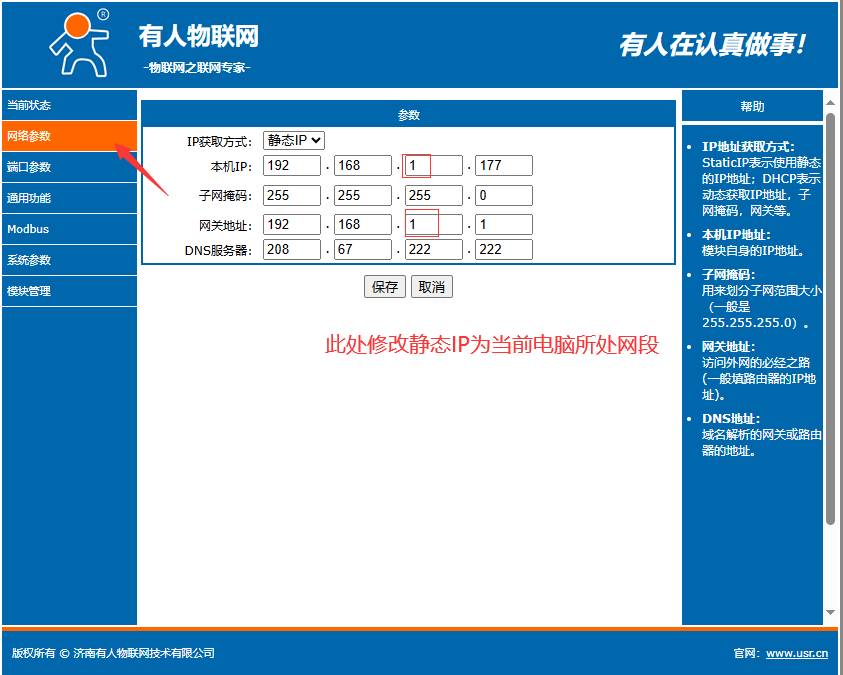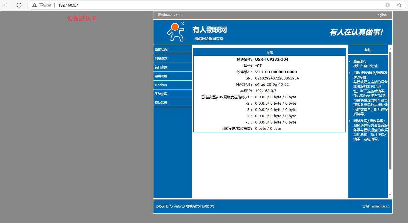 1-4-3、配置完成后打开浏览器输入设备默认IP:192.168.0.7 访问有人USR-TCP232-304设备后台管理界面