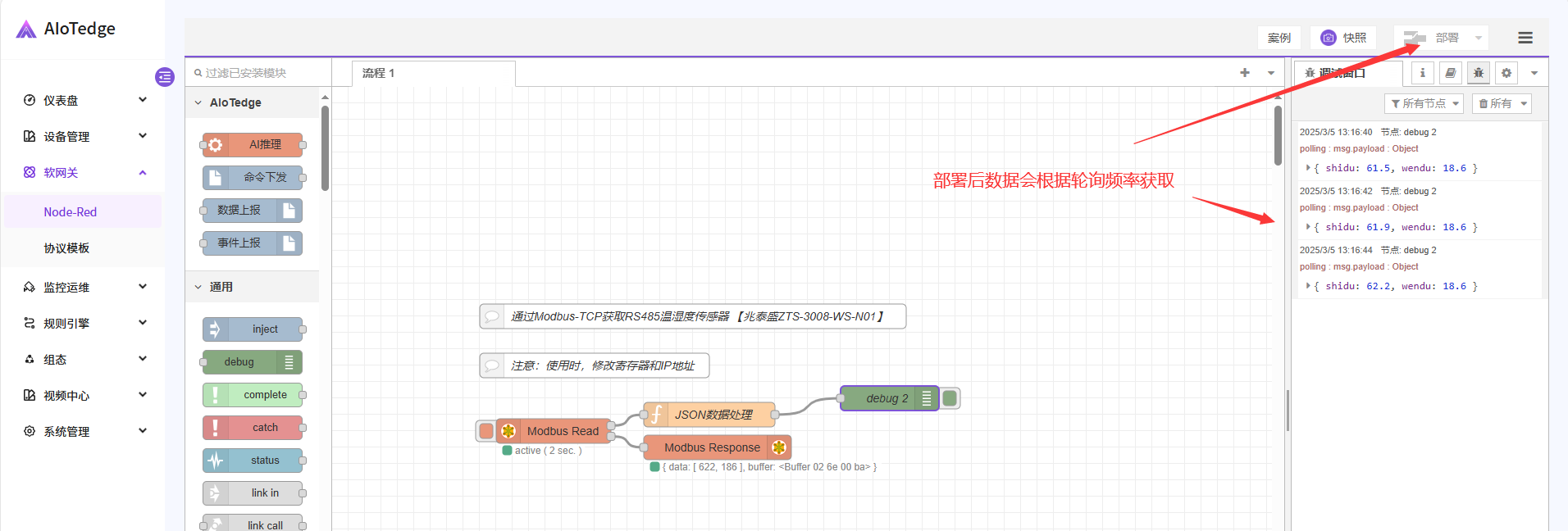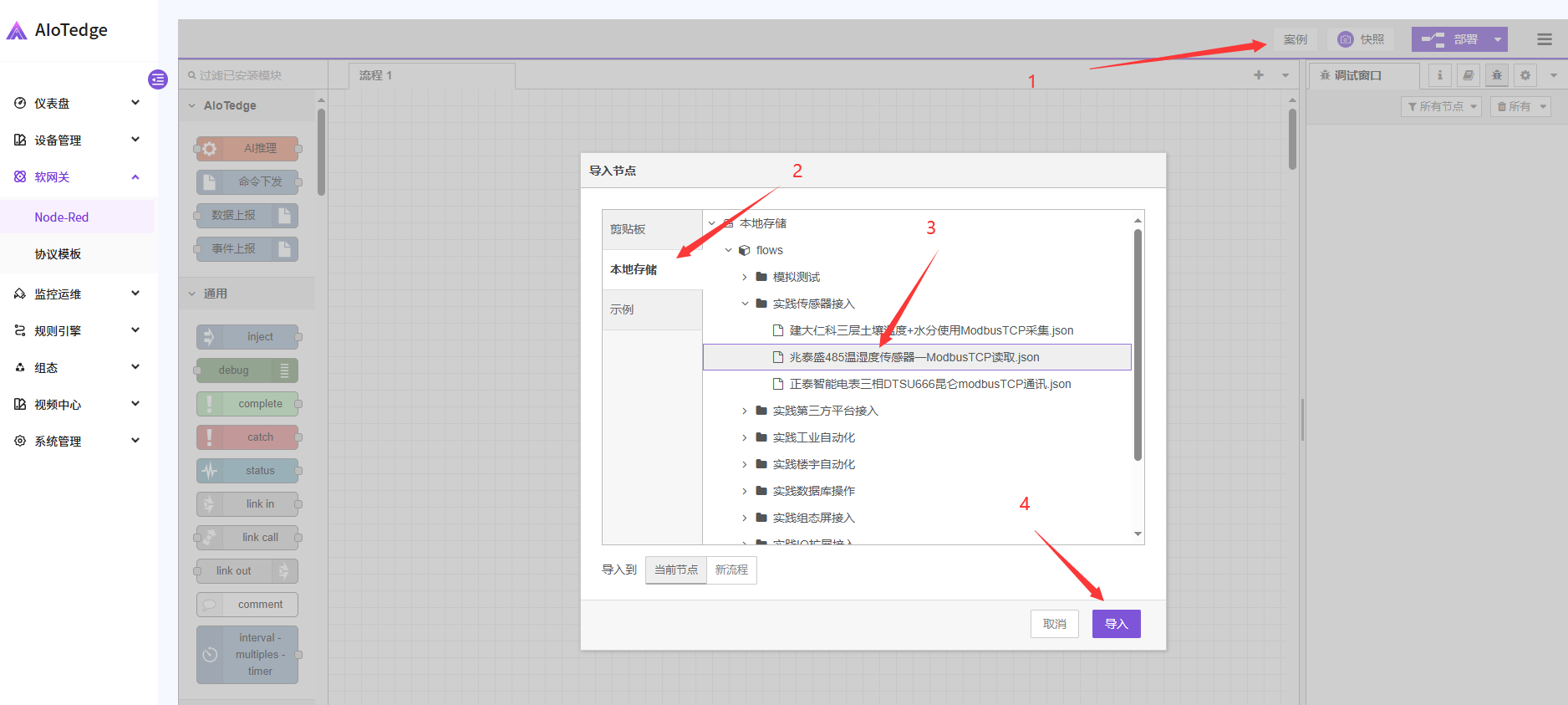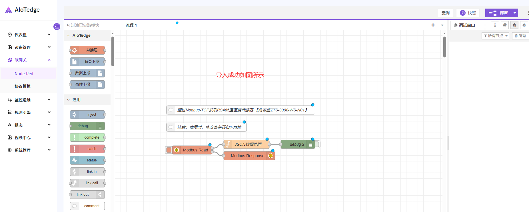 2-3、通过案例导入配置,接入USR-TCP232-304并获取传感器信息