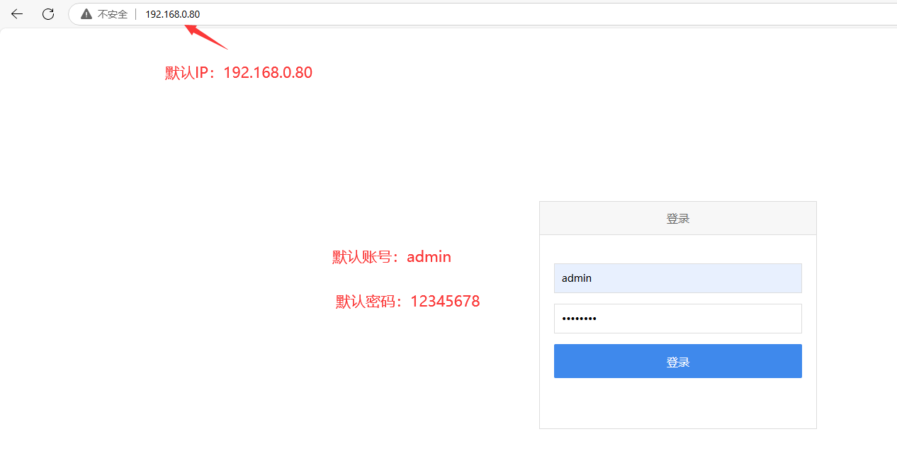 1-4-3、配置完成后打开浏览器输入设备默认IP:192.168.0.80 访问TAS-LAN-475设备后台管理界面