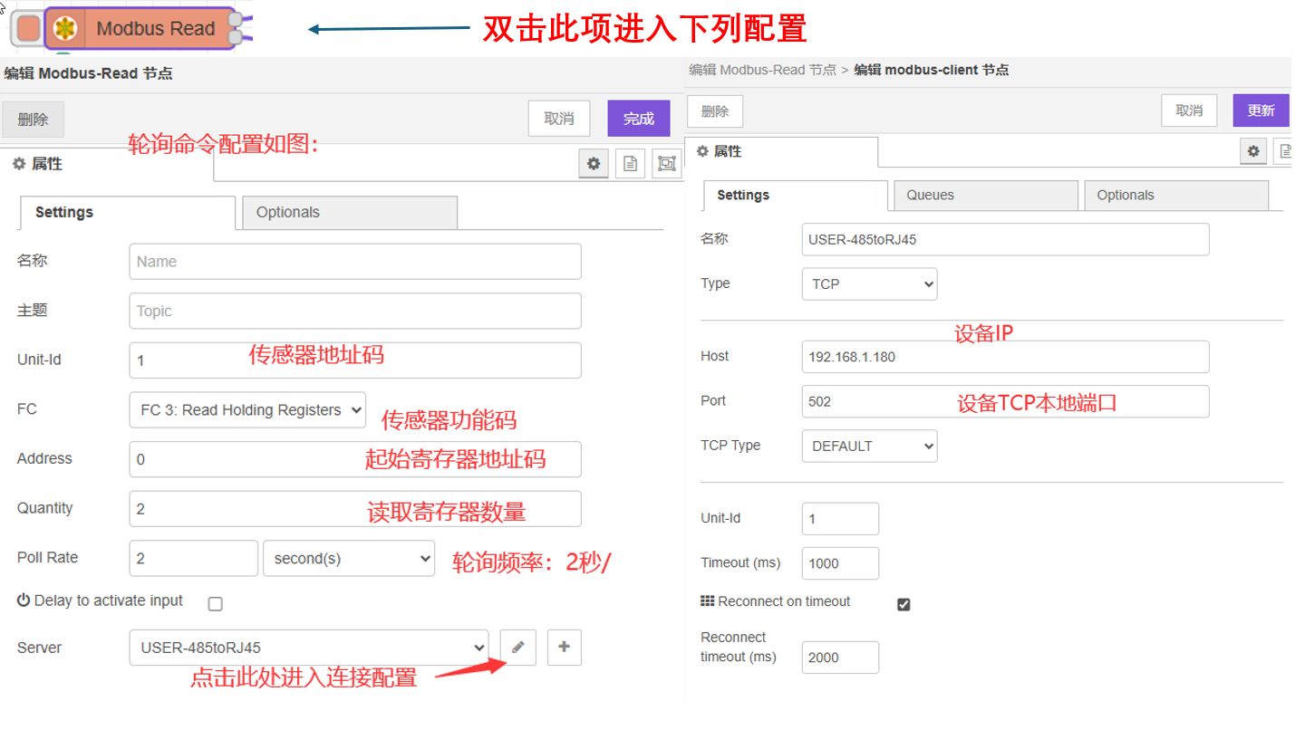 2-3、通过案例导入配置,接入USR-TCP232-304并获取传感器信息