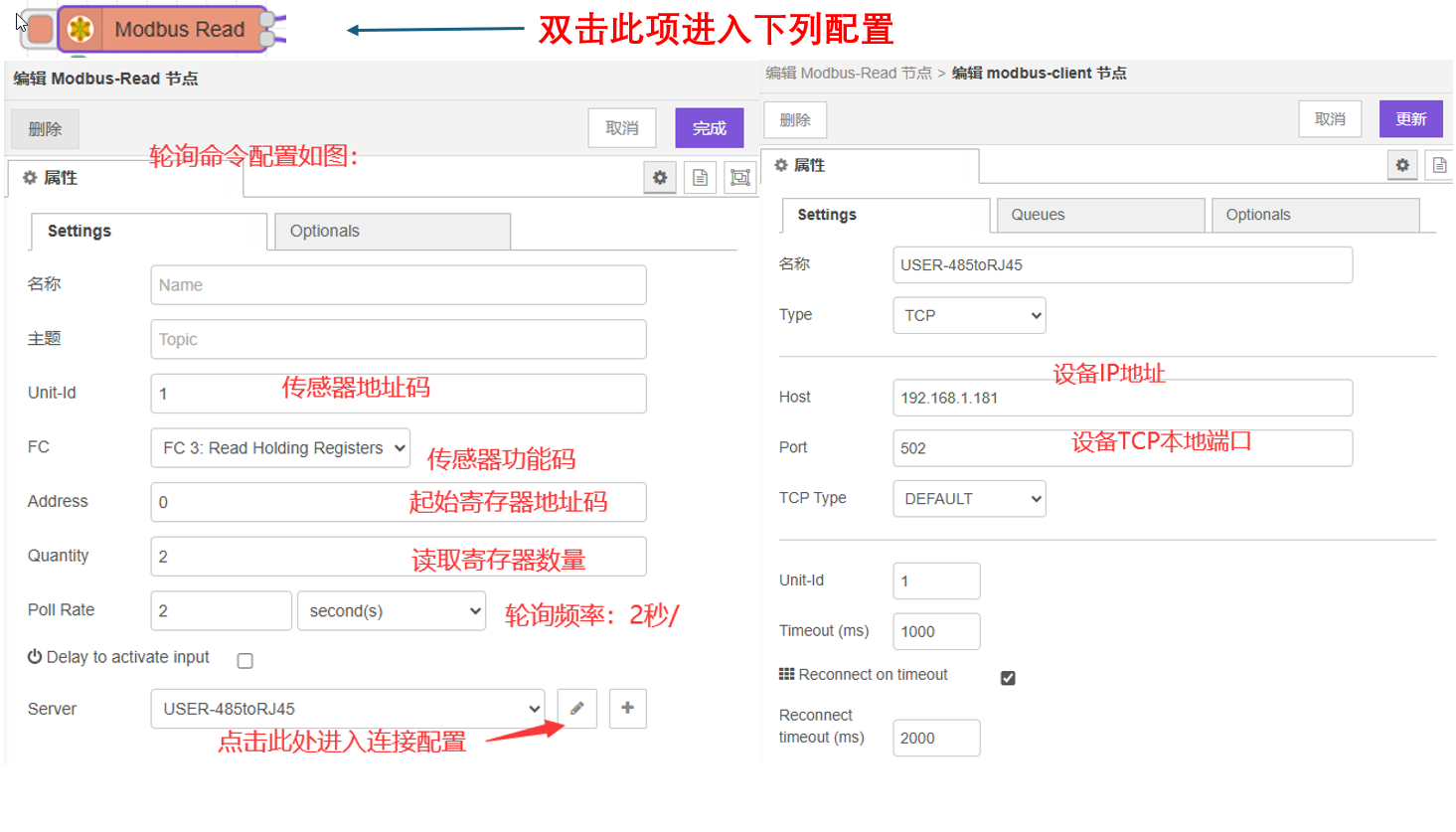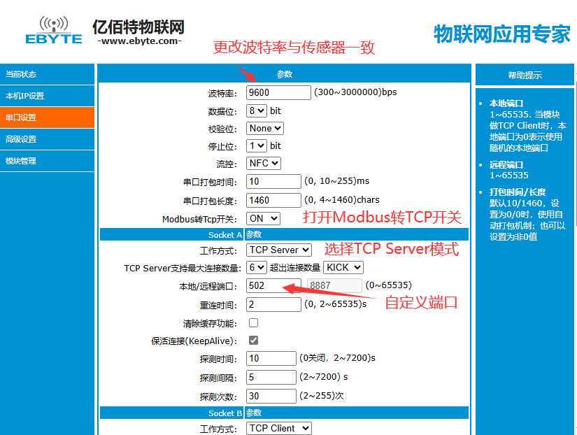 因配置时的场景不同,导入配置中的传感器设备地址码或EBYTE设备的IP及其端口有所差异,可作如下更改: