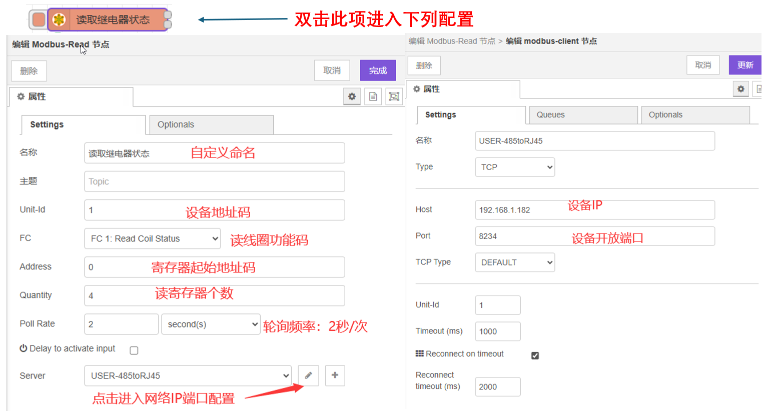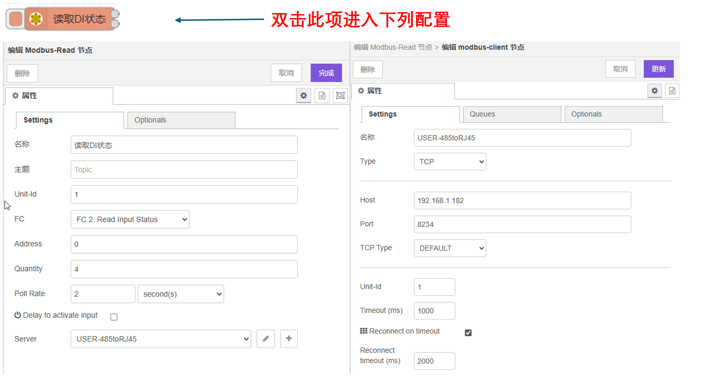 因配置时的场景不同,导入配置中的传感器设备地址码或EBYTE设备的IP及其端口有所差异,可作如下更改:
