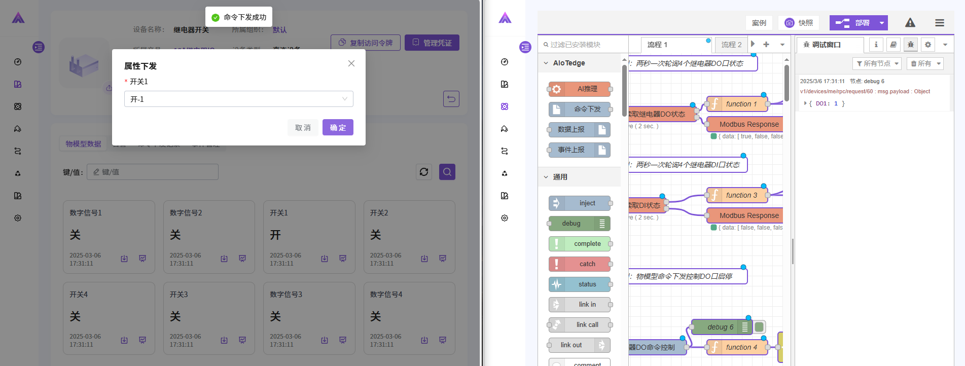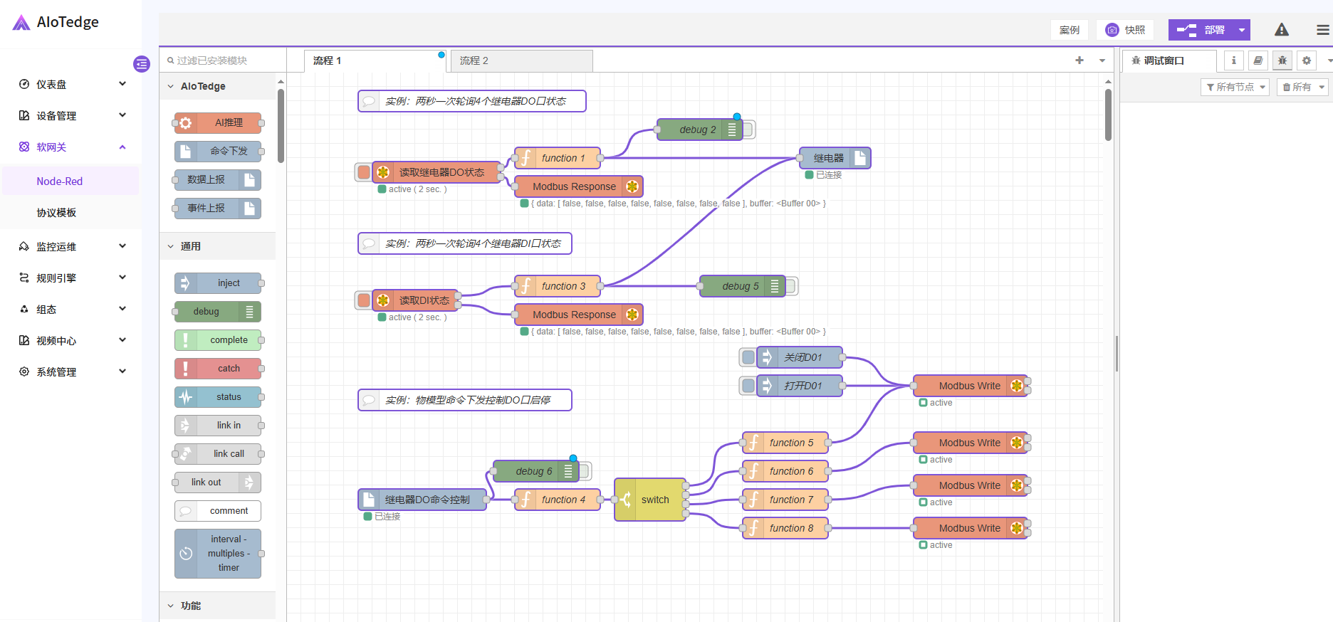 [{"id":"af57f951bbe289ba","type":"modbus-read","z":"d5dc9da6e54e4c8e","name":"读取继电器DO状态","topic":"","showStatusActivities":false,"logIOActivities":false,"showErrors":false,"showWarnings":true,"unitid":"1","dataType":"Coil","adr":"0","quantity":"4","rate":"2","rateUnit":"s","delayOnStart":true,"startDelayTime":"0.2","server":"fd895ac228bdb9b4","useIOFile":false,"ioFile":"","useIOForPayload":false,"emptyMsgOnFail":false,"x":210,"y":140,"wires":[["9a212f6efa4b19fe"],["0b87fc2531097e45"]]},{"id":"0b87fc2531097e45","type":"modbus-response","z":"d5dc9da6e54e4c8e","name":"","registerShowMax":20,"x":410,"y":160,"wires":[]},{"id":"55b94f99614e19ae","type":"debug","z":"d5dc9da6e54e4c8e","name":"debug 2","active":false,"tosidebar":true,"console":false,"tostatus":false,"complete":"false","statusVal":"","statusType":"auto","x":580,"y":80,"wires":[]},{"id":"9a212f6efa4b19fe","type":"function","z":"d5dc9da6e54e4c8e","name":"function 1","func":"var json = msg.payload;nvar flag = {n "DO1": json[0],n "DO2": json[1],n "DO3": json[2],n "DO4": json[3]n}nnmsg.payload = flag;nnreturn msg;","outputs":1,"timeout":0,"noerr":0,"initialize":"","finalize":"","libs":[],"x":380,"y":120,"wires":[["55b94f99614e19ae","4c60e9d15dca40a9"]]},{"id":"4c60e9d15dca40a9","type":"mqtt-out","z":"d5dc9da6e54e4c8e","name":"继电器","deviceProfileId":"d98cd850-f99e-11ef-b417-f75d50ad5b4d","organizationId":"623732c0-f578-11ef-94fc-3f249dd3e932","entityId":"08bf5d50-f99f-11ef-b417-f75d50ad5b4d","credentialsId":"5U47P19SD5010585","username":"","password":"","clientId":"","transportType":"DEFAULT","deviceType":"DIRECT_CONNECTION","gatewayId":"","thingsModelMapping":[],"x":770,"y":120,"wires":[]},{"id":"70455c9746c57843","type":"mqtt-in","z":"d5dc9da6e54e4c8e","name":"继电器DO命令控制","deviceProfileId":"d98cd850-f99e-11ef-b417-f75d50ad5b4d","organizationId":"623732c0-f578-11ef-94fc-3f249dd3e932","entityId":"08bf5d50-f99f-11ef-b417-f75d50ad5b4d","credentialsId":"5U47P19SD5010585","username":"","password":"","clientId":"","transportType":"DEFAULT","deviceType":"DIRECT_CONNECTION","gatewayId":"","sensorName":"","x":190,"y":600,"wires":[["e08aee73d76dac01","ae7e82d79a101417"]]},{"id":"b57b17f445cc4753","type":"modbus-read","z":"d5dc9da6e54e4c8e","name":"读取DI状态","topic":"","showStatusActivities":false,"logIOActivities":false,"showErrors":false,"showWarnings":true,"unitid":"1","dataType":"Input","adr":"0","quantity":"4","rate":"2","rateUnit":"s","delayOnStart":true,"startDelayTime":"0.5","server":"fd895ac228bdb9b4","useIOFile":false,"ioFile":"","useIOForPayload":false,"emptyMsgOnFail":false,"x":180,"y":320,"wires":[["a41908142dfa2d19"],["4c06a83c5b60e1f3"]]},{"id":"4c06a83c5b60e1f3","type":"modbus-response","z":"d5dc9da6e54e4c8e","name":"","registerShowMax":20,"x":410,"y":340,"wires":[]},{"id":"fb090c0a9bcefabd","type":"debug","z":"d5dc9da6e54e4c8e","name":"debug 5","active":false,"tosidebar":true,"console":false,"tostatus":false,"complete":"false","statusVal":"","statusType":"auto","x":640,"y":300,"wires":[]},{"id":"a41908142dfa2d19","type":"function","z":"d5dc9da6e54e4c8e","name":"function 3","func":"var json = msg.payload;nvar flag = {n "DI1": json[0],n "DI2": json[1],n "DI3": json[2],n "DI4": json[3]n}nnmsg.payload = flag;nnreturn msg;","outputs":1,"timeout":0,"noerr":0,"initialize":"","finalize":"","libs":[],"x":380,"y":300,"wires":[["fb090c0a9bcefabd","4c60e9d15dca40a9"]]},{"id":"c5ad62523e17a132","type":"comment","z":"d5dc9da6e54e4c8e","name":"实例:两秒一次轮询4个继电器DO口状态","info":"寄存器地址:nn温度:0000 Hn湿度:0001 H","x":260,"y":40,"wires":[]},{"id":"1224024d44a452e4","type":"comment","z":"d5dc9da6e54e4c8e","name":"实例:两秒一次轮询4个继电器DI口状态","info":"寄存器地址:nn温度:0000 Hn湿度:0001 H","x":250,"y":240,"wires":[]},{"id":"205bb2e7c601a85a","type":"comment","z":"d5dc9da6e54e4c8e","name":"实例:物模型命令下发控制DO口启停","info":"寄存器地址:nn温度:0000 Hn湿度:0001 H","x":250,"y":460,"wires":[]},{"id":"815e7213cf6ff0f7","type":"switch","z":"d5dc9da6e54e4c8e","name":"","property":"payload["value1"]","propertyType":"msg","rules":[{"t":"eq","v":"DO1","vt":"str"},{"t":"eq","v":"DO2","vt":"str"},{"t":"eq","v":"DO3","vt":"str"},{"t":"eq","v":"DO4","vt":"str"}],"checkall":"true","repair":false,"outputs":4,"x":510,"y":600,"wires":[["8a5c2e2e1e0e355f"],["d8d36b094d2a7eeb"],["63f31eccdb87e33d"],["c4b55fcf270d2d48"]]},{"id":"ecedfb85ddb5c37d","type":"modbus-write","z":"d5dc9da6e54e4c8e","name":"","showStatusActivities":false,"showErrors":false,"showWarnings":true,"unitid":"01","dataType":"Coil","adr":"00","quantity":"1","server":"fd895ac228bdb9b4","emptyMsgOnFail":false,"keepMsgProperties":false,"delayOnStart":false,"startDelayTime":"","x":960,"y":440,"wires":[[],[]]},{"id":"0f93d446b69ad1ac","type":"modbus-write","z":"d5dc9da6e54e4c8e","name":"","showStatusActivities":false,"showErrors":false,"showWarnings":true,"unitid":"01","dataType":"Coil","adr":"01","quantity":"1","server":"fd895ac228bdb9b4","emptyMsgOnFail":false,"keepMsgProperties":false,"delayOnStart":false,"startDelayTime":"","x":960,"y":520,"wires":[[],[]]},{"id":"44ddaceda1b906b0","type":"modbus-write","z":"d5dc9da6e54e4c8e","name":"","showStatusActivities":false,"showErrors":false,"showWarnings":true,"unitid":"01","dataType":"Coil","adr":"03","quantity":"1","server":"fd895ac228bdb9b4","emptyMsgOnFail":false,"keepMsgProperties":false,"delayOnStart":false,"startDelayTime":"","x":960,"y":640,"wires":[[],[]]},{"id":"b51a6eb7bab2714d","type":"modbus-write","z":"d5dc9da6e54e4c8e","name":"","showStatusActivities":false,"showErrors":false,"showWarnings":true,"unitid":"01","dataType":"Coil","adr":"02","quantity":"1","server":"fd895ac228bdb9b4","emptyMsgOnFail":false,"keepMsgProperties":false,"delayOnStart":false,"startDelayTime":"","x":960,"y":580,"wires":[[],[]]},{"id":"6c804a5aaef84629","type":"inject","z":"d5dc9da6e54e4c8e","name":"打开D01","props":[{"p":"payload"},{"p":"topic"