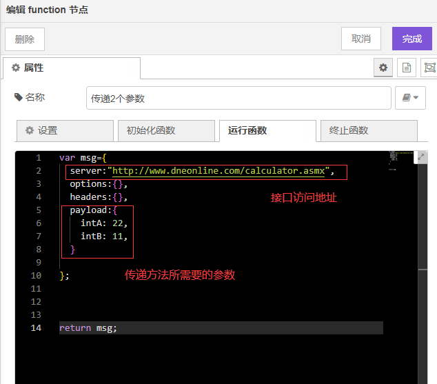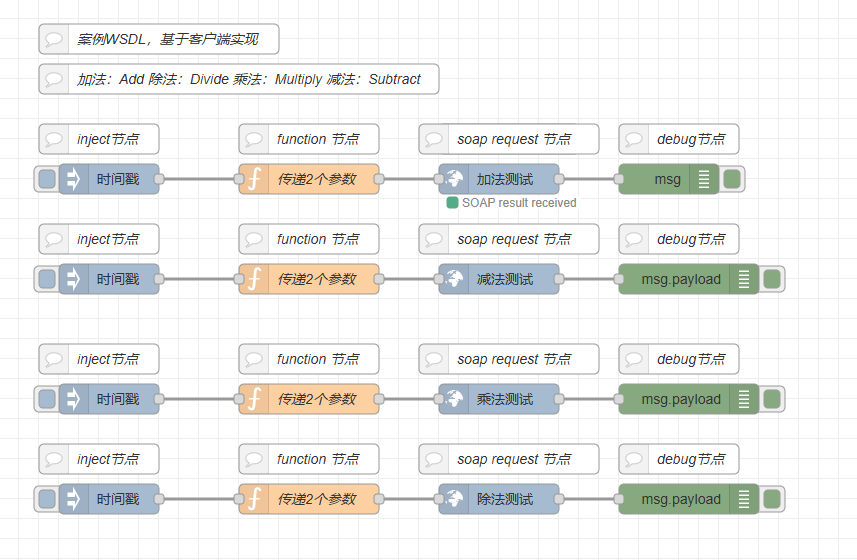 [{"id":"e480824b.767f","type":"soap request","z":"d2599a5f4826044e","name":"加法测试","topic":"","wsdl":"1d0b9627.18e18a","method":"Add","x":640,"y":260,"wires":[["5bd47eca.8fd67"]]},{"id":"a2176fcf.cb88","type":"inject","z":"d2599a5f4826044e","name":"","props":[{"p":"payload"},{"p":"topic","vt":"str"}],"repeat":"","crontab":"","once":false,"onceDelay":"","topic":"","payload":"","payloadType":"date","x":250,"y":260,"wires":[["5e12abf.dccd454"]]},{"id":"5bd47eca.8fd67","type":"debug","z":"d2599a5f4826044e","name":"","active":true,"console":"false","complete":"false","x":830,"y":260,"wires":[]},{"id":"5e12abf.dccd454","type":"function","z":"d2599a5f4826044e","name":"传递2个参数","func":"var msg={n  server:"http://www.dneonline.com/calculator.asmx",n  options:{},n  headers:{},n  payload:{n    intA:"22",n    intB: "11",n  }n  n};nnnnreturn msg;","outputs":1,"timeout":"","noerr":0,"initialize":"","finalize":"","libs":[],"x":450,"y":260,"wires":[["e480824b.767f"]]},{"id":"d28d4781e77210b8","type":"comment","z":"d2599a5f4826044e","name":"案例WSDL","info":"http://www.dneonline.com/calculator.asmx?WSDLnnn这是一个在线,测试webservice的接口nn提供了四种方法:n加法:Addn除法:Dividen乘法:Multiplyn减法:Subtractnnn节点名称:node-red-contrib-soapn","x":240,"y":200,"wires":[]},{"id":"56b84cab6c1b4182","type":"comment","z":"d2599a5f4826044e","name":"加法:Add 除法:Divide 乘法:Multiply 减法:Subtract","info":"","x":720,"y":200,"wires":[]},{"id":"544c456025828702","type":"soap request","z":"d2599a5f4826044e","name":"减法测试","topic":"","wsdl":"1d0b9627.18e18a","method":"Subtract","x":640,"y":360,"wires":[["90c1e0d2a65965f1"]]},{"id":"73ae329f1fc9766a","type":"inject","z":"d2599a5f4826044e","name":"","props":[{"p":"payload"},{"p":"topic","vt":"str"}],"repeat":"","crontab":"","once":false,"onceDelay":"","topic":"","payload":"","payloadType":"date","x":250,"y":360,"wires":[["eaf403d383c6950a"]]},{"id":"90c1e0d2a65965f1","type":"debug","z":"d2599a5f4826044e","name":"","active":true,"console":"false","complete":"false","x":830,"y":360,"wires":[]},{"id":"eaf403d383c6950a","type":"function","z":"d2599a5f4826044e","name":"传递2个参数","func":"var msg={n  server:"http://www.dneonline.com/calculator.asmx",n  options:{},n  headers:{},n  payload:{n    intA:"22",n    intB: "11",n  }n  n};nnnnreturn msg;","outputs":1,"timeout":"","noerr":0,"initialize":"","finalize":"","libs":[],"x":450,"y":360,"wires":[["544c456025828702"]]},{"id":"d3a038e2a906e9d2","type":"soap request","z":"d2599a5f4826044e","name":"除法测试 ","topic":"","wsdl":"1d0b9627.18e18a","method":"Divide","x":640,"y":580,"wires":[["28837fa9041c462b"]]},{"id":"8bb909d38c09261a","type":"inject","z":"d2599a5f4826044e","name":"","props":[{"p":"payload"},{"p":"topic","vt":"str"}],"repeat":"","crontab":"","once":false,"onceDelay":"","topic":"","payload":"","payloadType":"date","x":250,"y":580,"wires":[["8ccda167eef854e4"]]},{"id":"28837fa9041c462b","type":"debug","z":"d2599a5f4826044e","name":"","active":true,"console":"false","complete":"false","x":830,"y":580,"wires":[]},{"id":"8ccda167eef854e4","type":"function","z":"d2599a5f4826044e","name":"传递2个参数","func":"var msg={n  server:"http://www.dneonline.com/calculator.asmx",n  options:{},n  headers:{},n  payload:{n    intA:"22",n    intB: "11",n  }n  n};nnnnreturn msg;","outputs":1,"timeout":"","noerr":0,"initialize":"","finalize":"","libs":[],"x":450,"y":580,"wires":[["d3a038e2a906e9d2"]]},{"id":"47a8346682d0693e","type":"soap request","z":"d2599a5f4826044e","name":"乘法测试","topic":"","wsdl":"1d0b9627.18e18a","method":"Multiply","x":640,"y":480,"wires":[["e890ce5de60a20a9"]]},{"id":"061cb48932ee1922","type":"inject","z":"d2599a5f4826044e","name":"","props":[{"p":"payload"},{"p":"topic","vt":"str"}],"repeat":"","crontab":"","once":false,"onceDelay":"","topic":"","payload":"","payloadType":"date","x":250,"y":480,"wires":[["b2ed6e6416dde034"]]},{"id":"e890ce5de60a20a9","type":"debug","z":"d2599a5f4826044e","name":"","active":true,"console":"false","complete":"false","x":830,"y":480,"wires":[]},{"id":"b2ed6e6416dde034","type":"function","z":"d2599a5f4826044e","name":"传递2个参数","func":"var msg={n  server:"http://www.dneonline.com/calculator.asmx",n  options:{},n  headers:{},n  payload:{n    intA:"22",n    intB: "11",n  }n  n};nnnnreturn msg;","outputs":1,"timeout":"","noerr":0,"initialize":"","finalize":"","libs":[],"x":450,"y":480,"wires":[["47a8346682d0693e"]]},{"id":"1d0b9627.18e18a","type":"soap-config","z":"d2599a5f4826044e","wsdl":"http://www.dneonline.com/calculator.asmx?WSDL","auth":"0","user":"","pass":"","key":"","cert":"","token":""}]