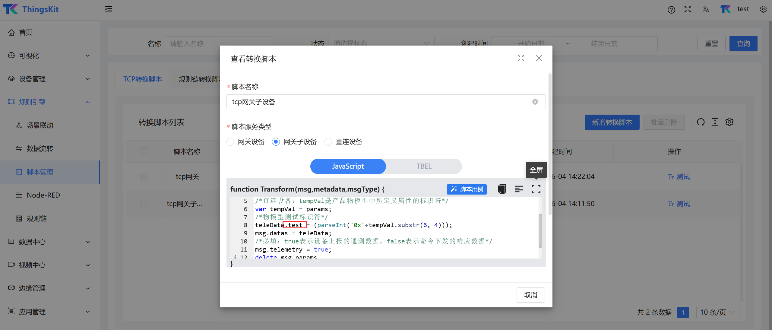 网关子设备使用的解析脚本需要单独配置,这里以及配置好了使用可以直接选择。