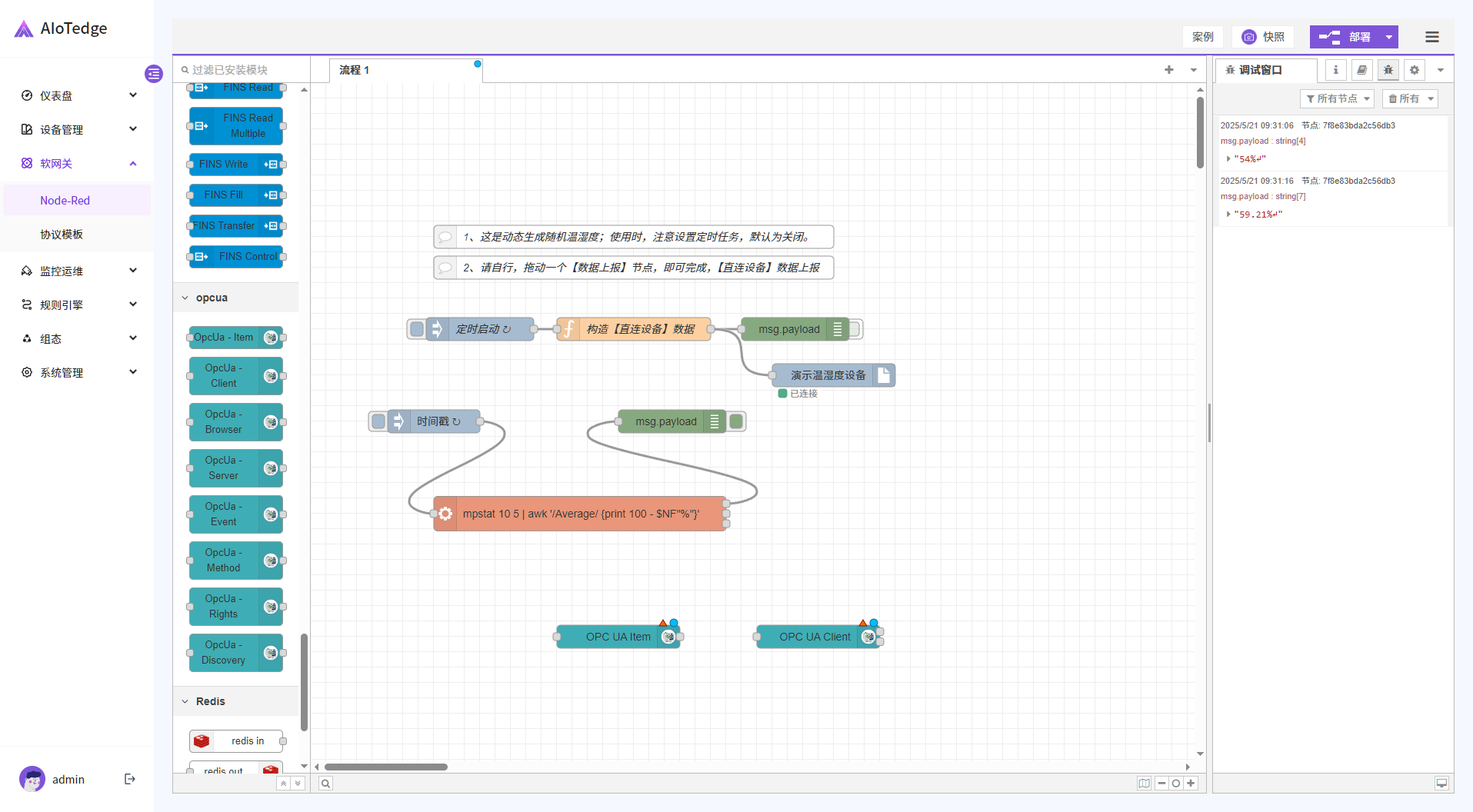 - 部署完成后,Node-RED将自动启动数据流,开始按照配置的逻辑读取OPC-UA数据,并进行相应的处理和输出。