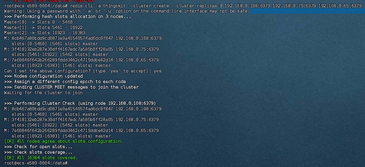 例如:redis-cli -a thingskit –cluster create 192.168.1.235:6379 192.168.1.236:6379 192.168.1.237:6379