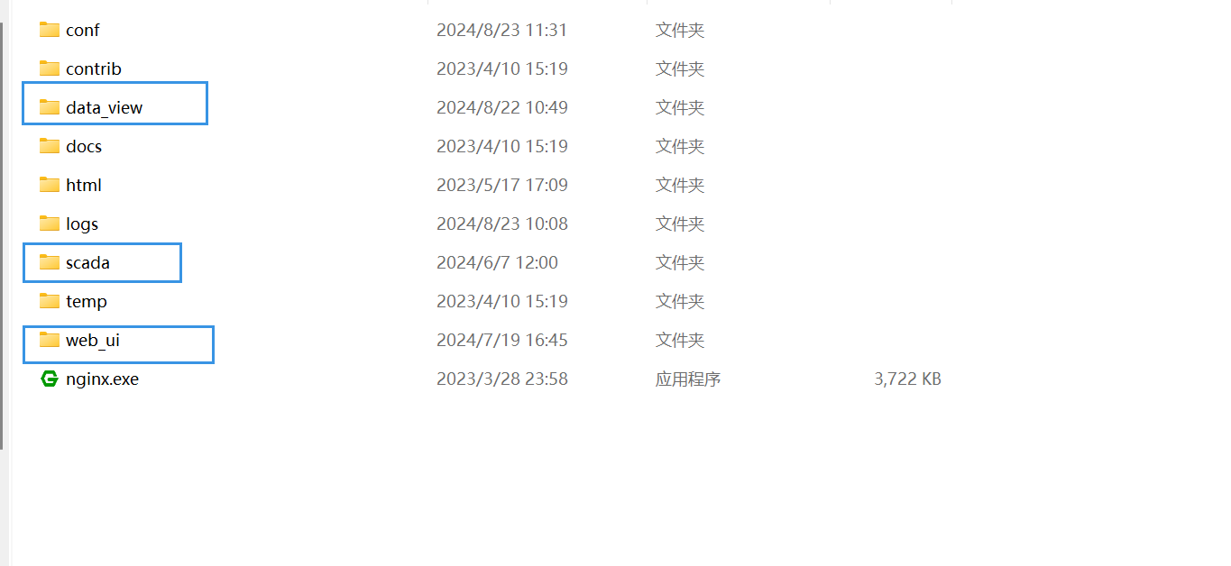 将前端文件data_view.zip、scada.zip、web_ui.zip放在nginx部署目录下,然后将nginx.conf修改为以下内容。data_view.zip,scada.zip需要购买额外扩展模块才会提供。
