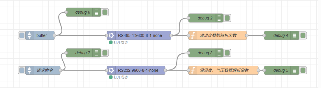 [{"id":"36f881c708c64b55","type":"serial port","z":"bfc81969979a1c7d","name":"","serial":"bfd091bd1d2c66fc","x":510,"y":200,"wires":[["44fa7e0d474ab8d0","7c0c1bbb324b9478"]]},{"id":"dec4f001fcbe05ca","type":"serial port","z":"bfc81969979a1c7d","name":"","serial":"2fead045a0e33697","x":500,"y":320,"wires":[["3a3baab6fceb38b2","31ceeef52e1185b3"]]},{"id":"0d23d2a9d966c60e","type":"inject","z":"bfc81969979a1c7d","name":"","props":[{"p":"payload"}],"repeat":"","crontab":"","once":false,"onceDelay":0.1,"topic":"","payload":"[1 ,3 ,0 ,0 ,0 ,2 ,196,11]","payloadType":"bin","x":240,"y":200,"wires":[["36f881c708c64b55","fa411c6d5632c37f"]]},{"id":"fe8a326ff1d1f6aa","type":"inject","z":"bfc81969979a1c7d","name":"","props":[{"p":"payload"}],"repeat":"","crontab":"","once":false,"onceDelay":0.1,"topic":"","payload":"[1,3,0,0,0,3,5,203]","payloadType":"bin","x":240,"y":320,"wires":[["dec4f001fcbe05ca","74b93a7dd22a1a87"]]},{"id":"fa411c6d5632c37f","type":"debug","z":"bfc81969979a1c7d","name":"debug 1","active":true,"tosidebar":true,"console":false,"tostatus":false,"complete":"false","statusVal":"","statusType":"auto","x":390,"y":140,"wires":[]},{"id":"74b93a7dd22a1a87","type":"debug","z":"bfc81969979a1c7d","name":"debug 2","active":true,"tosidebar":true,"console":false,"tostatus":false,"complete":"payload","targetType":"msg","statusVal":"","statusType":"auto","x":390,"y":260,"wires":[]},{"id":"44fa7e0d474ab8d0","type":"function","z":"bfc81969979a1c7d","name":"function 1","func":"nvar buffer = msg.payload;nconst addressCode = buffer[0];n// const functionCode = buffer[1];n// const byteCount = buffer[2];nconst humidityBytes = [buffer[3], buffer[4]];nconst temperatureBytes = [buffer[5], buffer[6]];nn// 计算湿度值nconst humidity = parseInt(humidityBytes.map(byte => byte.toString(16).padStart(2, '0')).join(''), 16);nn// 计算温度值nconst temperature = parseInt(temperatureBytes.map(byte => byte.toString(16).padStart(2, '0')).join(''), 16);nnvar jsonData = {n "wendu": temperature / 10,n "shidu": humidity / 10n}nmsg.payload = jsonData;nreturn msg;","outputs":1,"timeout":0,"noerr":0,"initialize":"","finalize":"","libs":[],"x":730,"y":200,"wires":[["c6a8e236aa4a8370"]]},{"id":"3a3baab6fceb38b2","type":"function","z":"bfc81969979a1c7d","name":"function 2","func":"var buffer = msg.payload;nconst addressCode = buffer[0];n// const functionCode = buffer[1];n// const byteCount = buffer[2];nnconst temperatureBytes = [buffer[3],buffer[4]];nconst humidityBytes = [buffer[5],buffer[6]];nconst airPressureBytes = [buffer[7], buffer[8]];nn// 计算温度值nconst temperature = parseInt(temperatureBytes.map(byte => byte.toString(16).padStart(2, '0')).join(''), 16);n// 计算湿度值nconst humidity = parseInt(humidityBytes.map(byte => byte.toString(16).padStart(2,'0')).join(''),16);n// 计算气压值nconst airPressure = parseInt(airPressureBytes.map(byte => byte.toString(16).padStart(2, '0')).join(''), 16);nnvar jsonData = {n "wendu":(temperature/100-40).toFixed(2),n "shidu": humidity / 100,n "qiya": airPressure / 10n}nmsg.payload = jsonData;nreturn msg;nn","outputs":1,"timeout":0,"noerr":0,"initialize":"","finalize":"","libs":[],"x":740,"y":320,"wires":[["518bbcc53e188e9a"]]},{"id":"c6a8e236aa4a8370","type":"debug","z":"bfc81969979a1c7d","name":"debug 3","active":true,"tosidebar":true,"console":false,"tostatus":false,"complete":"false","statusVal":"","statusType":"auto","x":910,"y":200,"wires":[]},{"id":"518bbcc53e188e9a","type":"debug","z":"bfc81969979a1c7d","name":"debug 4","active":true,"tosidebar":true,"console":false,"tostatus":false,"complete":"false","statusVal":"","statusType":"auto","x":910,"y":320,"wires":[]},{"id":"7c0c1bbb324b9478","type":"debug","z":"bfc81969979a1c7d","name":"debug 5","active":true,"tosidebar":true,"console":false,"tostatus":false,"complete":"false","statusVal":"","statusType":"auto","x":700,"y":160,"wires":[]},{"id":"31ceeef52e1185b3","type":"debug","z":"bfc81969979a1c7d","name":"debug 6","active":true,"tosidebar":true,"console":false,"tostatus":false,"complete":"false","statusVal":"","statusType":"auto","x":700,"y":260,"wires":[]},{"id":"bfd091bd1d2c66fc","type":"serial config","name":"","serialport":"/dev/ttyS8","baudrate":"9600","databits":"8","stopbits":"1","parity":"none","timeout":"50","reqtimeout":"1000"},{"id":"2fead045a0e33697","type":"serial config","name":"","serialport":"/dev/ttyS6","baudrate":"9600","databits":"8","stopbits":"1","parity":"none","timeout":"50","reqtimeout":"1000"}]