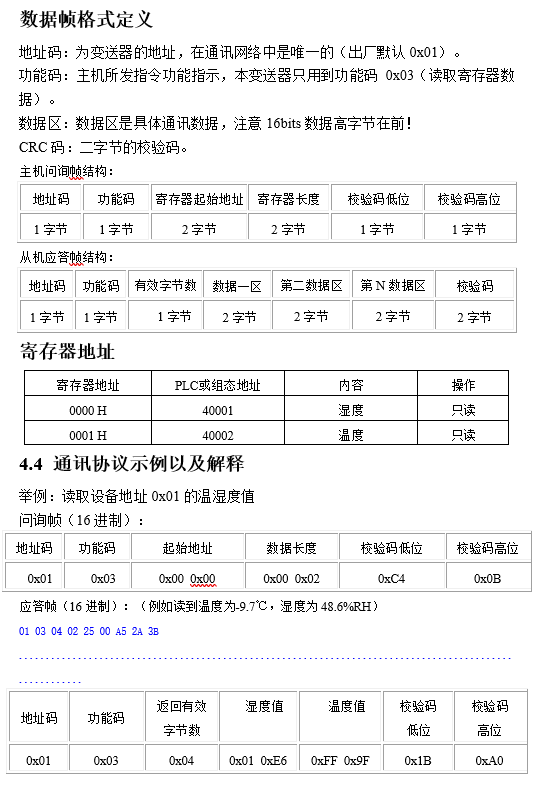 RS485温湿度采集命令为:[1 ,3 ,0 ,0 ,0 ,2 ,196,11]