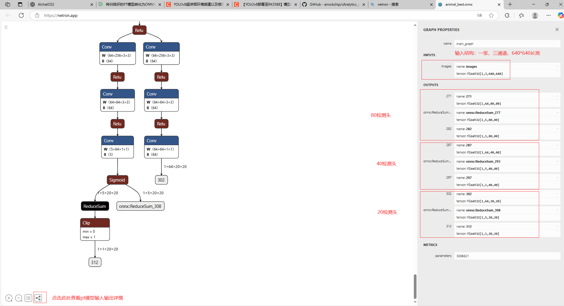 PS:上图的三个检测头红色方框非常重要,YOLOv8在RKNN转换过程中,是要有三个分支的,分别80×80检测头,40×40检测头,20×20检测头。每个检测头下,都有三个输出,分别是box边框输出,即图上的1×64×80×80;还有各类别输出,即1×5×80×80(这里的5就是指我在PT模型训练时的animal.yaml文件中定义了5个类别),最后是综合置信度输出,即1×1×80×80。(其余检测头同理)