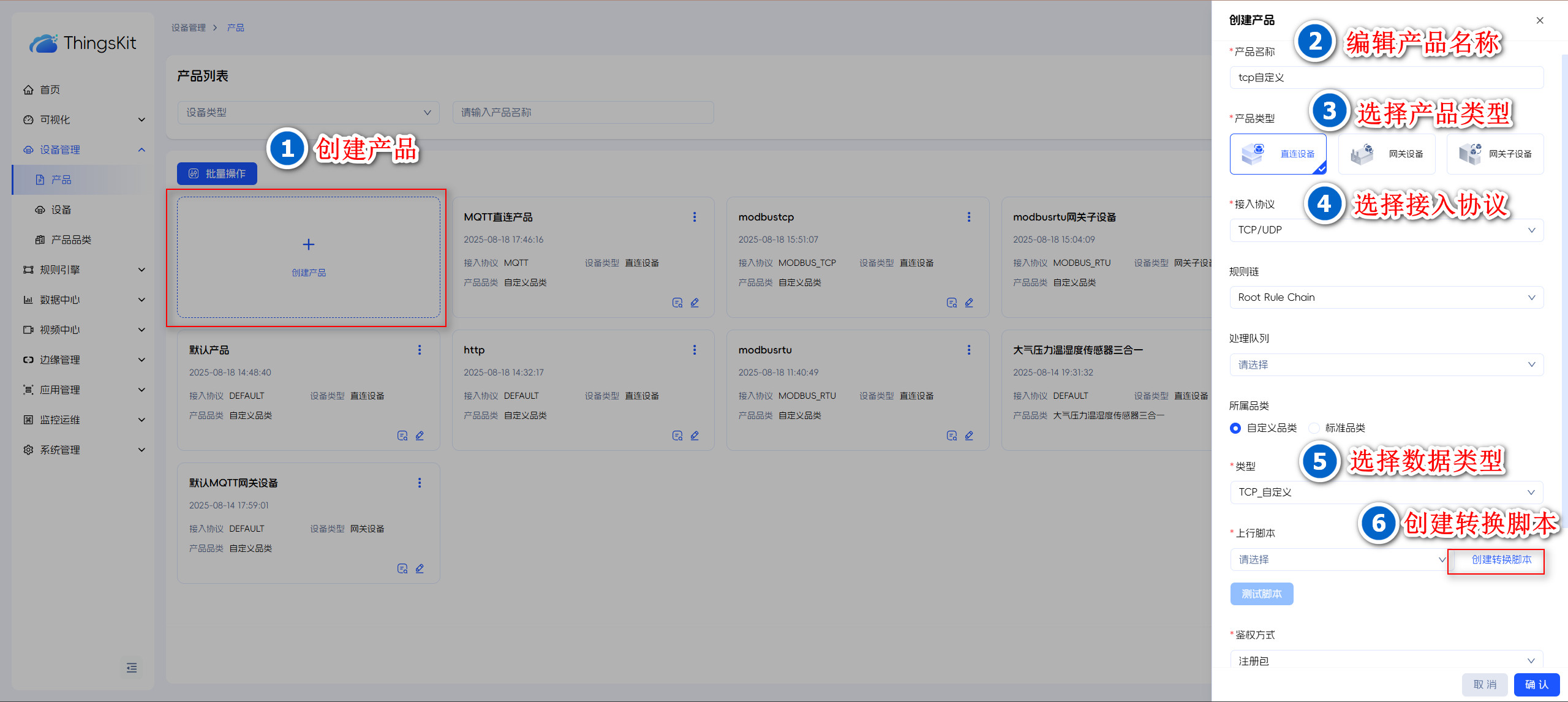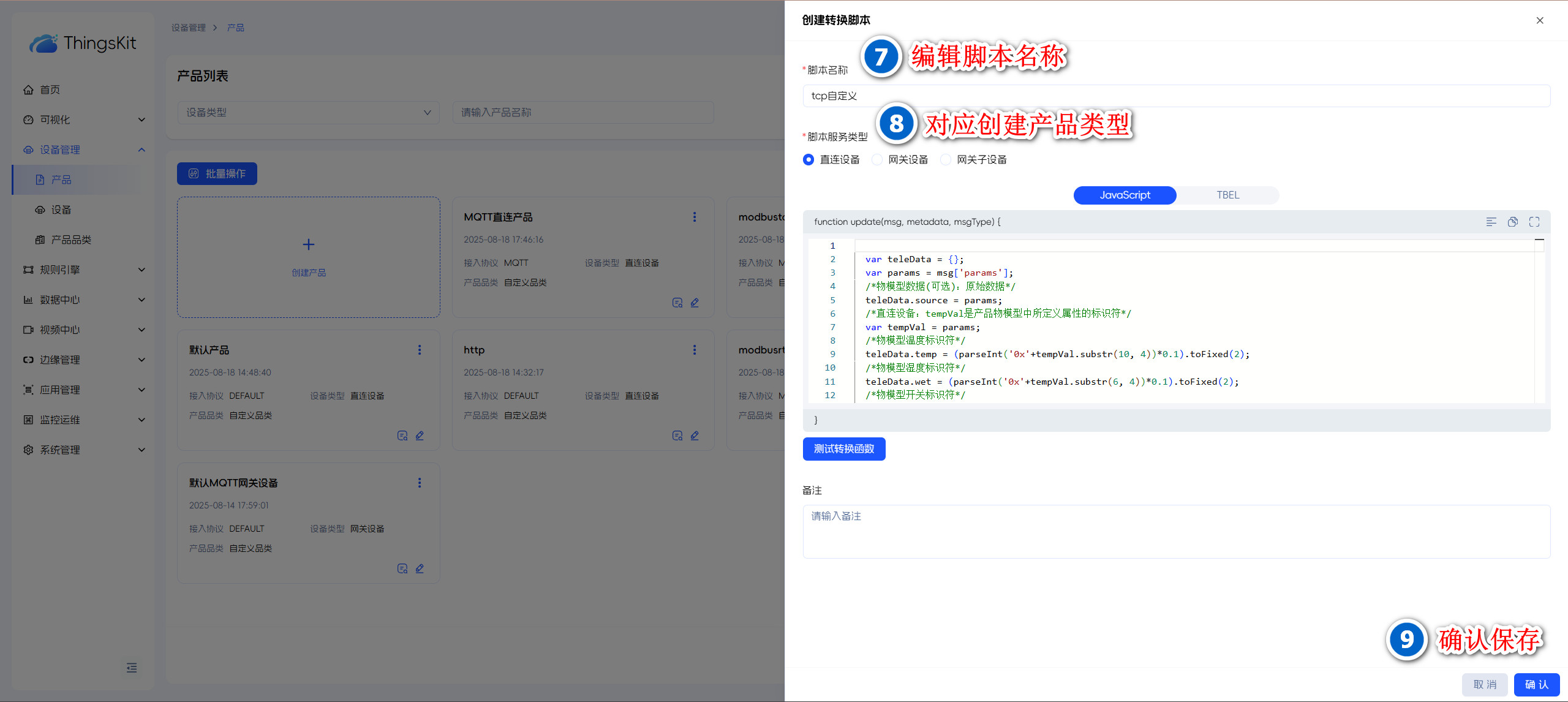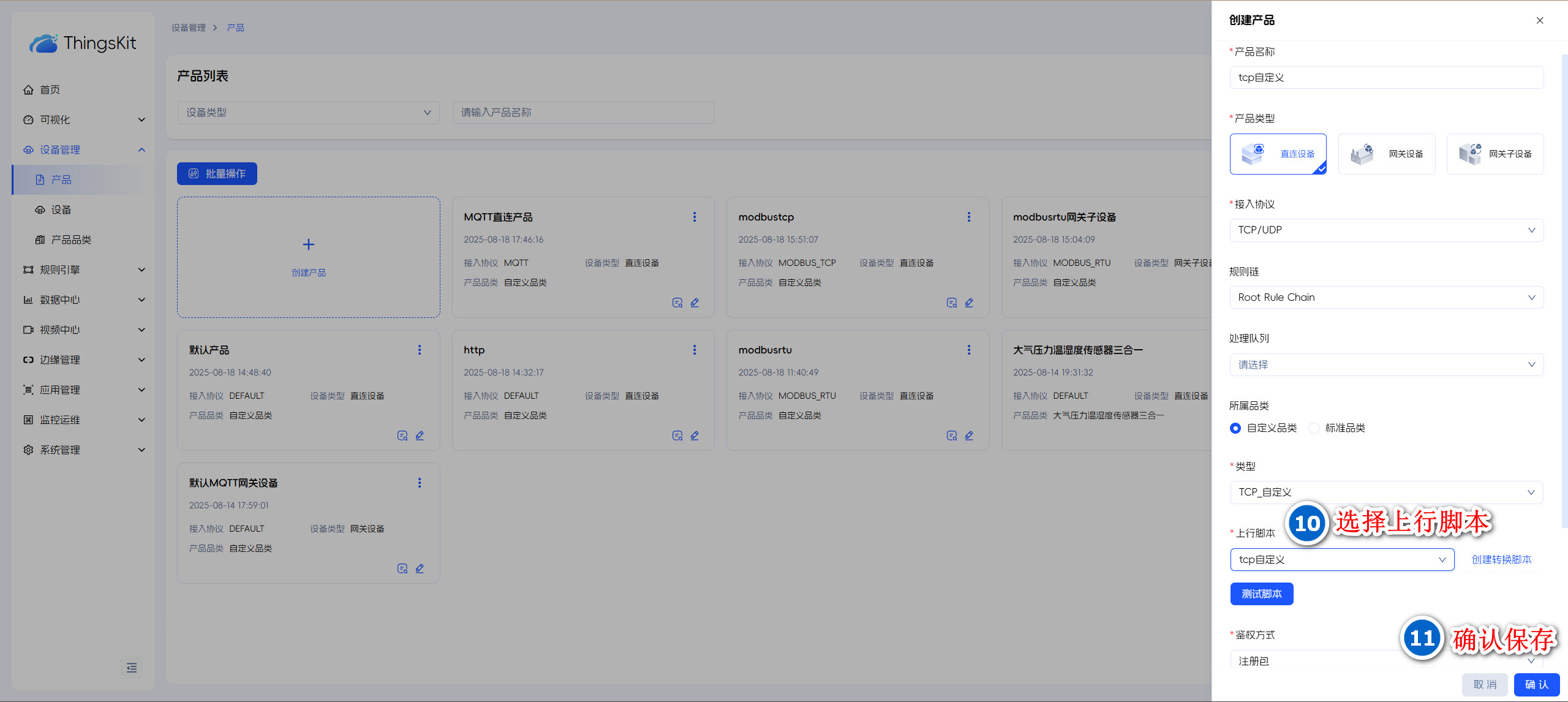 TCP自定义类型的设备是指上报数据为需要编辑脚本解析的类型。平台提供了默认脚本,接入实际设备时可自行按照设备通信协议文档编辑对应脚本。