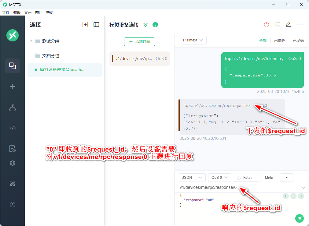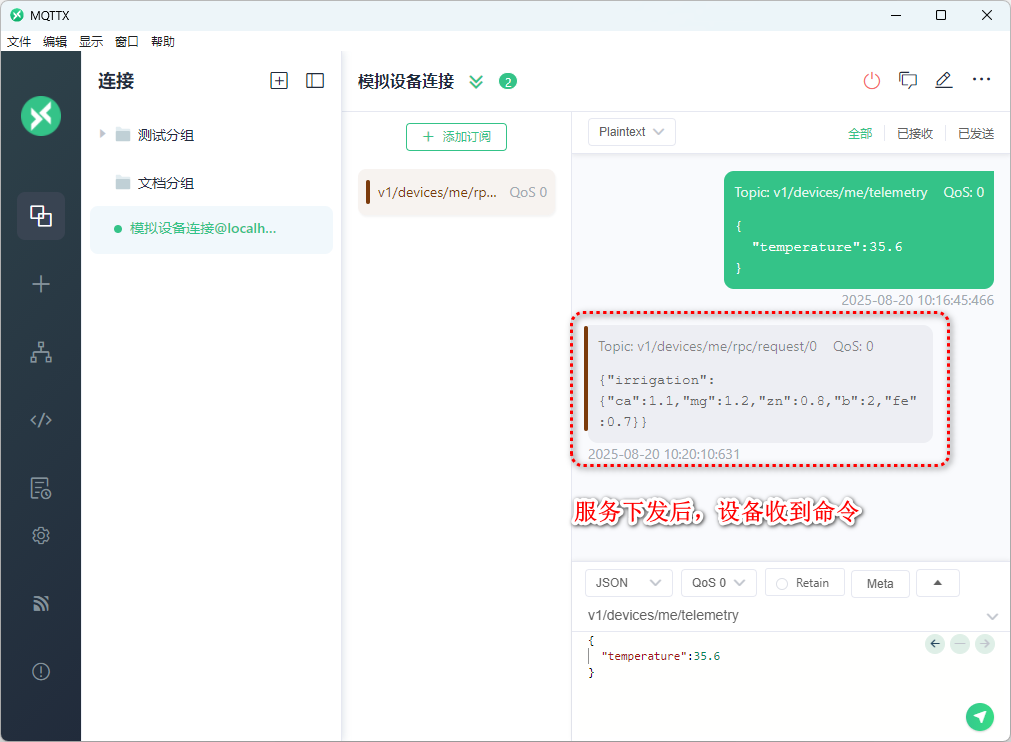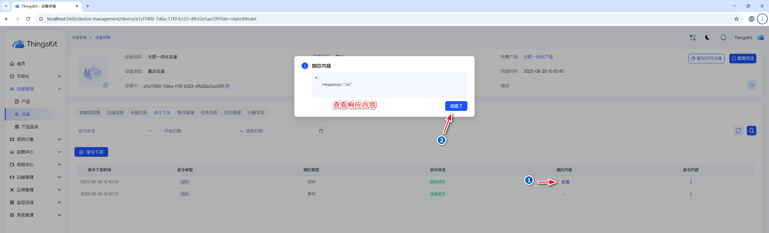 同步命令即双向命令下发,需要设备端收到命令后对服务端进行命令回复。回复的内容可以是自定义,但必须是json格式。请参考设备命令下发